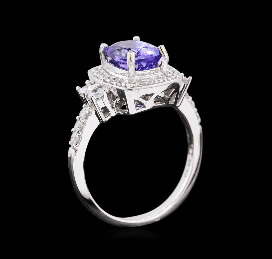 One electronically tested 14KT white gold ladies cast tanzanite and diamond ring with a bright polish finish. Trademark is ORIANNE. Identified with markings of "14K". Condition is new, good workmanship. Containing: One prong set rectangular cushion mixed cut natural tanzanite, measuring 8.50 x 6.00 x 5.00mm, 10%. bulge factor, approximate weight of 2.21ct., clarity is eye clean, type I, medium, very slightly grayish, violetish blue color, (GIA vB 5/3), cut is good. Transmitting light with no distortion, transparent. Graded in the setting. Tanzanite is a very rare gemstone that is only found in the country of Tanzania. Originally discovered in 1967. Tiffany & Company, named the stone Tanzanite. It is found in the Usumburu Mountains that border the Umba Valley of northern Tanzania. Tanzanite occurs in gray, brown, violet, blue, reddish-purple, & green. The gem is interesting because of its exceptional pleochroism. Rotated in different directions a tanzanite will exhibit multiple changes of color. Tanzanite has a low tolerance to ultrasonic cleaning, and should not be cleaned using this method. Thirty-Four prong set round brilliant cut diamonds, measuring 2.60 - 1.20 x 1.14mm (depth est.) approximate total weight of 34 Stones = 0.65ct. Graded in the setting. Clarity: SI-1 to I-1. Color: G - I. Total Weight of Colored Stones 2.21ct. Total Weight of Diamonds 0.65ct. AIG Appraised at $7,975.00.