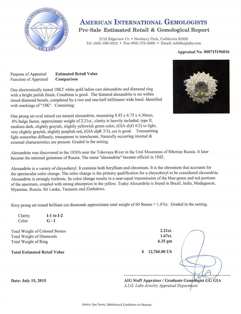 One electronically tested 18KT white gold ladies cast alexandrite and diamond ring with a bright polish finish. The featured alexandrite is set within tiered diamond bezels, completed by a two and one-half millimeter wide band. Identified with markings of AIG Appraised at $12,760.00.