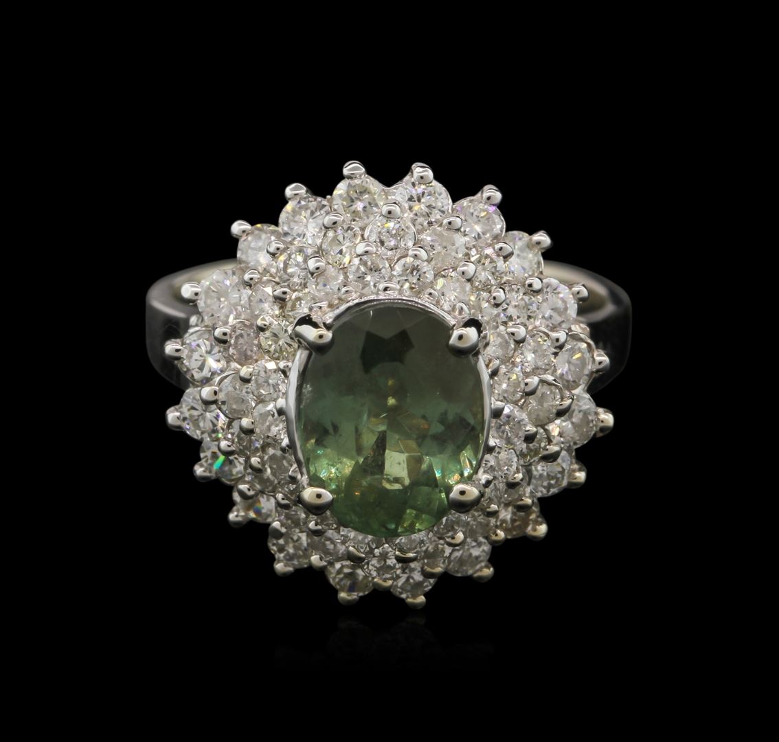 One electronically tested 18KT white gold ladies cast alexandrite and diamond ring with a bright polish finish. The featured alexandrite is set within tiered diamond bezels, completed by a two and one-half millimeter wide band. Identified with markings of "18K". Condition is good. Containing: One prong set oval mixed cut natural alexandrite, measuring 8.85 x 6.75 x 4.30mm, 6% bulge factor, approximate weight of 2.21ct., clarity is heavily included, type II, medium dark, slightly grayish, slightly yellowish green color, (GIA slyG 6/2) to light, very slightly grayish, slightly purplish red, (GIA slpR 3/3), cut is good. Transmitting light somewhat diffusely, transparent to translucent. Naturally occurring internal & external characteristics are present. Graded in the setting. Alexandrite was discovered in the 1830's near the Tokovaya River in the Ural Mountains of Siberian Russia. It later became the national gemstone of Russia. The name "alexandrite" became official in 1842.Alexandrite is a variety of chrysoberyl. It contains both beryllium and chromium. It is the chromium that accounts for the spectacular color change. The color change is the primary qualification for a chrysoberyl to be considered alexandrite. Alexandrite is strongly trichroic. Its color change results in a near-equal transmission of the blue-green and red portions of the spectrum, coupled with strong absorption in the yellow. Today Alexandrite is found in Brazil, India, Madagascar, Myanmar, Russia, Sri Lanka, Tanzania and Zimbabwe. Sixty prong set round brilliant cut diamonds approximate total weight of 60 Stones = 1.67ct. Graded in the setting. Clarity: I-1 to I-2. Color: G - I. Total Weight of Colored Stones 2.21ct. Total Weight of Diamonds 1.67ct. Total Weight of Ring 6.35gm. AIG Appraised at $12,760.00.