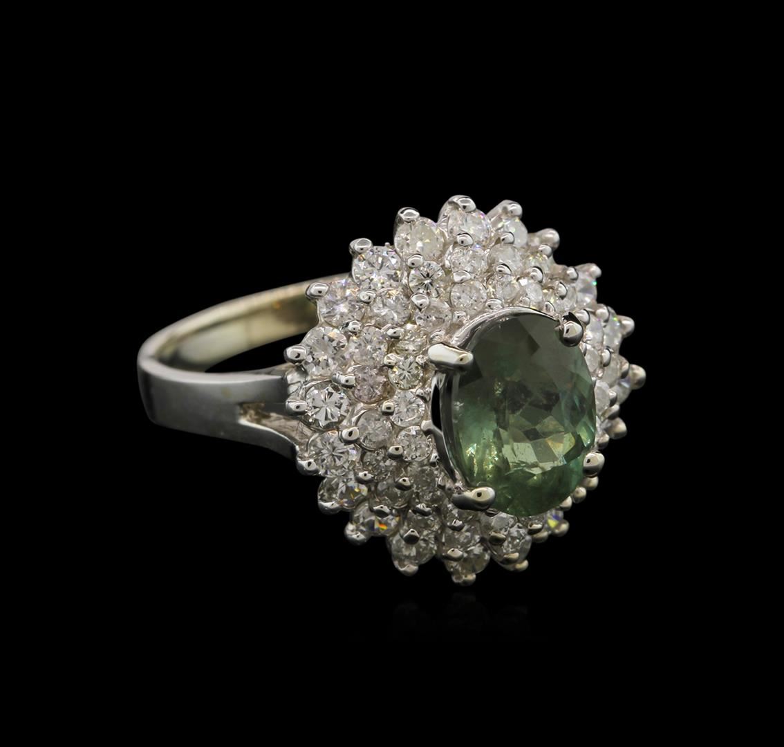One electronically tested 18KT white gold ladies cast alexandrite and diamond ring with a bright polish finish. The featured alexandrite is set within tiered diamond bezels, completed by a two and one-half millimeter wide band. Identified with markings of "18K". Condition is good. Containing: One prong set oval mixed cut natural alexandrite, measuring 8.85 x 6.75 x 4.30mm, 6% bulge factor, approximate weight of 2.21ct., clarity is heavily included, type II, medium dark, slightly grayish, slightly yellowish green color, (GIA slyG 6/2) to light, very slightly grayish, slightly purplish red, (GIA slpR 3/3), cut is good. Transmitting light somewhat diffusely, transparent to translucent. Naturally occurring internal & external characteristics are present. Graded in the setting. Alexandrite was discovered in the 1830's near the Tokovaya River in the Ural Mountains of Siberian Russia. It later became the national gemstone of Russia. The name "alexandrite" became official in 1842.Alexandrite is a variety of chrysoberyl. It contains both beryllium and chromium. It is the chromium that accounts for the spectacular color change. The color change is the primary qualification for a chrysoberyl to be considered alexandrite. Alexandrite is strongly trichroic. Its color change results in a near-equal transmission of the blue-green and red portions of the spectrum, coupled with strong absorption in the yellow. Today Alexandrite is found in Brazil, India, Madagascar, Myanmar, Russia, Sri Lanka, Tanzania and Zimbabwe. Sixty prong set round brilliant cut diamonds approximate total weight of 60 Stones = 1.67ct. Graded in the setting. Clarity: I-1 to I-2. Color: G - I. Total Weight of Colored Stones 2.21ct. Total Weight of Diamonds 1.67ct. Total Weight of Ring 6.35gm. AIG Appraised at $12,760.00.