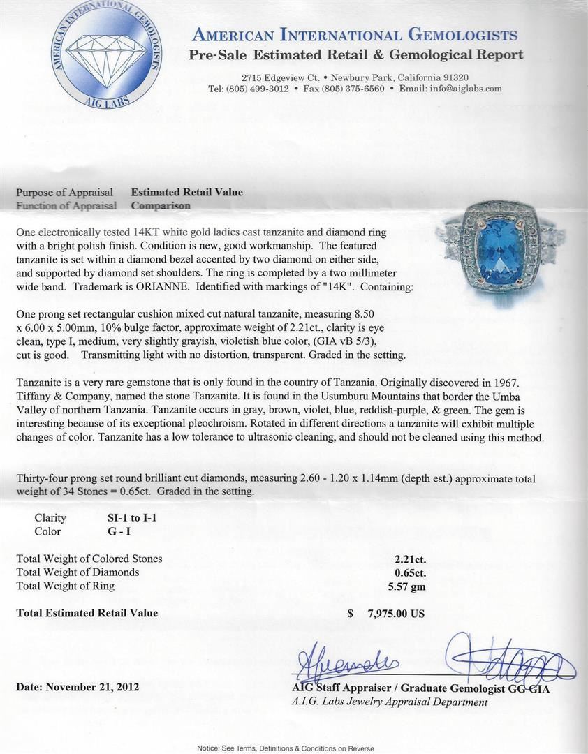 One electronically tested 14KT white gold ladies cast tanzanite and diamond ring with a bright polish finish. Trademark is ORIANNE. Identified with markings of "14K". Condition is new, good workmanship. Containing: One prong set rectangular cushion mixed cut natural tanzanite, measuring 8.50 x 6.00 x 5.00mm, 10%. bulge factor, approximate weight of 2.21ct., clarity is eye clean, type I, medium, very slightly grayish, violetish blue color, (GIA vB 5/3), cut is good. Transmitting light with no distortion, transparent. Graded in the setting. Tanzanite is a very rare gemstone that is only found in the country of Tanzania. Originally discovered in 1967. Tiffany & Company, named the stone Tanzanite. It is found in the Usumburu Mountains that border the Umba Valley of northern Tanzania. Tanzanite occurs in gray, brown, violet, blue, reddish-purple, & green. The gem is interesting because of its exceptional pleochroism. Rotated in different directions a tanzanite will exhibit multiple changes of color. Tanzanite has a low tolerance to ultrasonic cleaning, and should not be cleaned using this method. Thirty-Four prong set round brilliant cut diamonds, measuring 2.60 - 1.20 x 1.14mm (depth est.) approximate total weight of 34 Stones = 0.65ct. Graded in the setting. Clarity: SI-1 to I-1. Color: G - I. Total Weight of Colored Stones 2.21ct. Total Weight of Diamonds 0.65ct. AIG Appraised at $7,975.00.