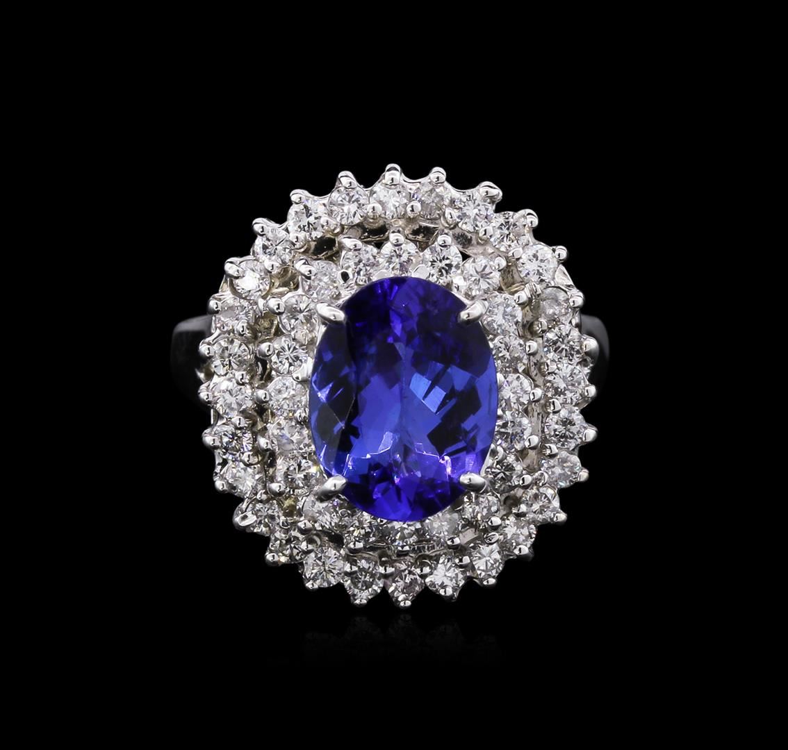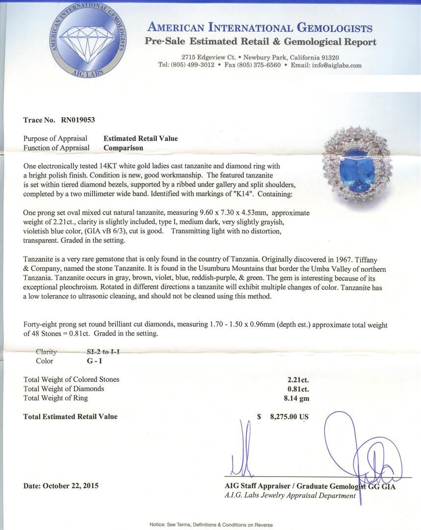 One electronically tested 14KT white gold ladies cast tanzanite and diamond ring with a bright polish finish. The featured tanzanite is set within tiered diamond bezels, supported by a ribbed under gallery and split shoulders, completed by a two millimeter wide band. Identified with markings of "K14". Condition is new, good workmanship. Containing: One prong set oval mixed cut natural tanzanite, measuring 9.60 x 7.30 x 4.53mm, approximate weight of 2.21ct., clarity is slightly included, type I, medium dark, very slightly grayish, violetish blue color, (GIA vB 6/3), cut is good. Transmitting light with no distortion, transparent. Graded in the setting. Tanzanite is a very rare gemstone that is only found in the country of Tanzania. Originally discovered in 1967. Tiffany & Company, named the stone Tanzanite. It is found in the Usumburu Mountains that border the Umba Valley of northern Tanzania. Tanzanite occurs in gray, brown, violet, blue, reddish-purple, & green. The gem is interesting because of its exceptional pleochroism. Rotated in different directions a tanzanite will exhibit multiple changes of color. Tanzanite has a low tolerance to ultrasonic cleaning, and should not be cleaned using this method. Forty-Eight prong set round brilliant cut diamonds, measuring 1.70 - 1.50 x 0.96mm (depth est.) approximate total weight of 48 Stones = 0.81ct. Graded in the setting. Clarity: SI-2 to I-1. Color: G - I. Total Weight of Colored Stones 2.21ct. Total Weight of Diamonds 0.81ct. Total Weight of Ring 8.14gm. AIG Appraised at $8,275.00.