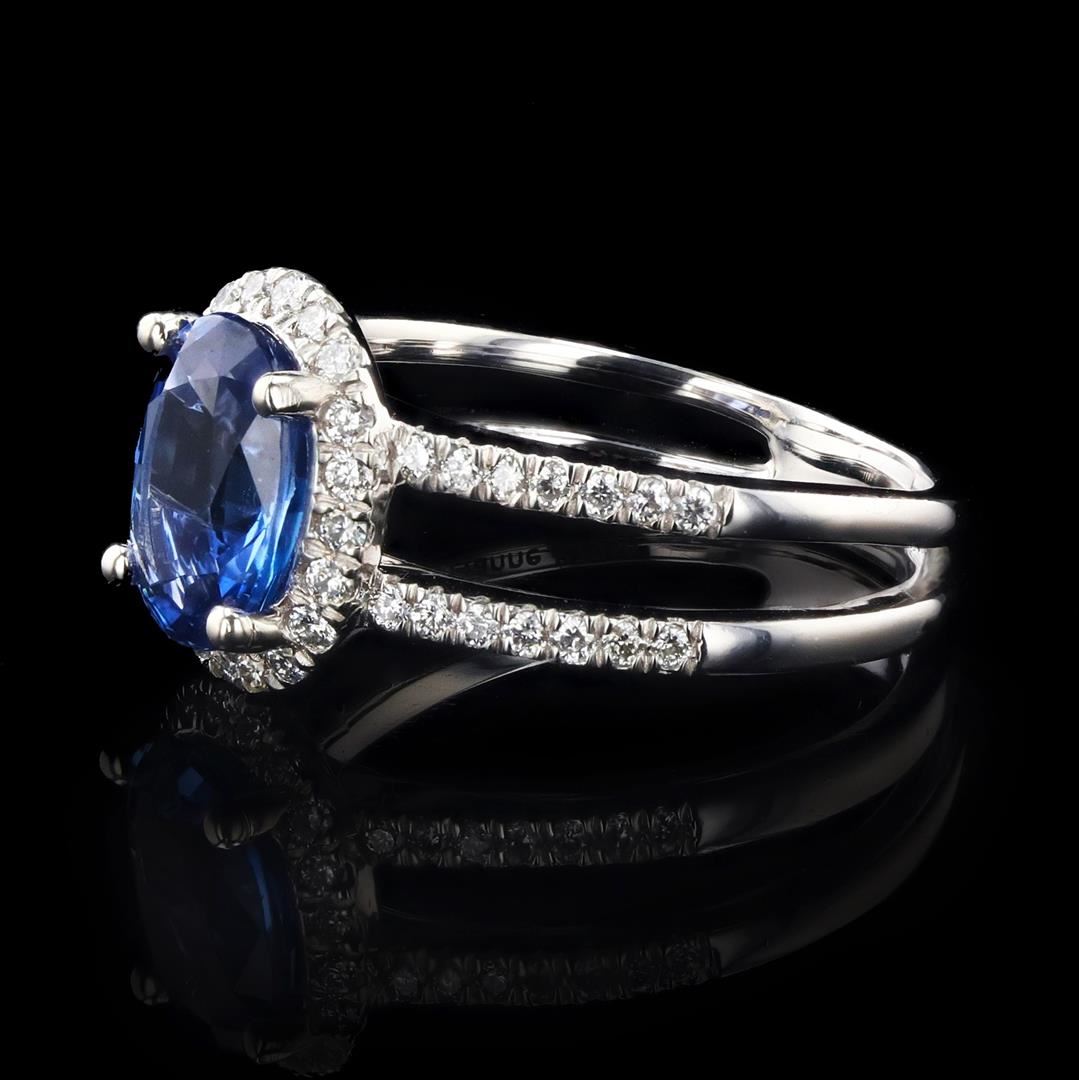 2.22ct Blue sapphire and 0.36ctw Diamond Platinum Ring. Please see Photos and Description for all available information. This gorgeous platinum ring features a 2.22ct round brilliant blue sapphire center stone surrounded by 48 round diamonds with a total weight of 0.36ct. The ring is size 6.