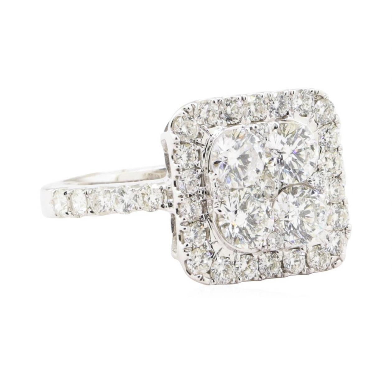 One electronically tested 14KT white gold lady's combination cast & assembled fashion ring with a square cathedral halo with a bright polish finish. The featured lady's ring has a shank measuring 2.55 millimeters wide. Identified with markings of '14K'. Condition is new, good workmanship. Containing: Four prong set round brilliant cut diamonds, measuring 4.40 - 4.30 x 2.70mm (depth est.) approximate total weight of 4 Stones = 1.25ct. Graded in the setting. Color H - I Clarity SI-1 to SI-2 Cut Very Good Thirty-Three prong set round brilliant cut diamonds, measuring 2.10 - 1.80 x 1.21mm (depth est.) approximate total weight of 33 Stones = 0.95ct. Graded in the setting. Color H - I Clarity SI-1 to SI-2 Cut Good Four prong set round brilliant cut diamonds, measuring 1.20 - 1.15 x 0.73mm (depth est.) approximate total weight of 4 Stones = 0.02ct. Graded in the setting. Color G - H Clarity SI-1 to SI-2 Cut Very Good. Total Weight of Diamonds 2.22ct.. Total Weight of Ring 4.00gm GAS Appraised at $7635.00. GAS Appraised.