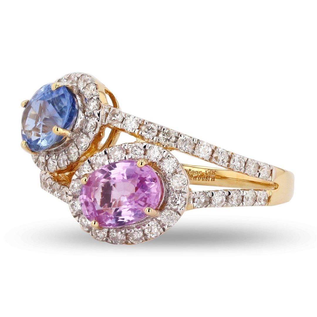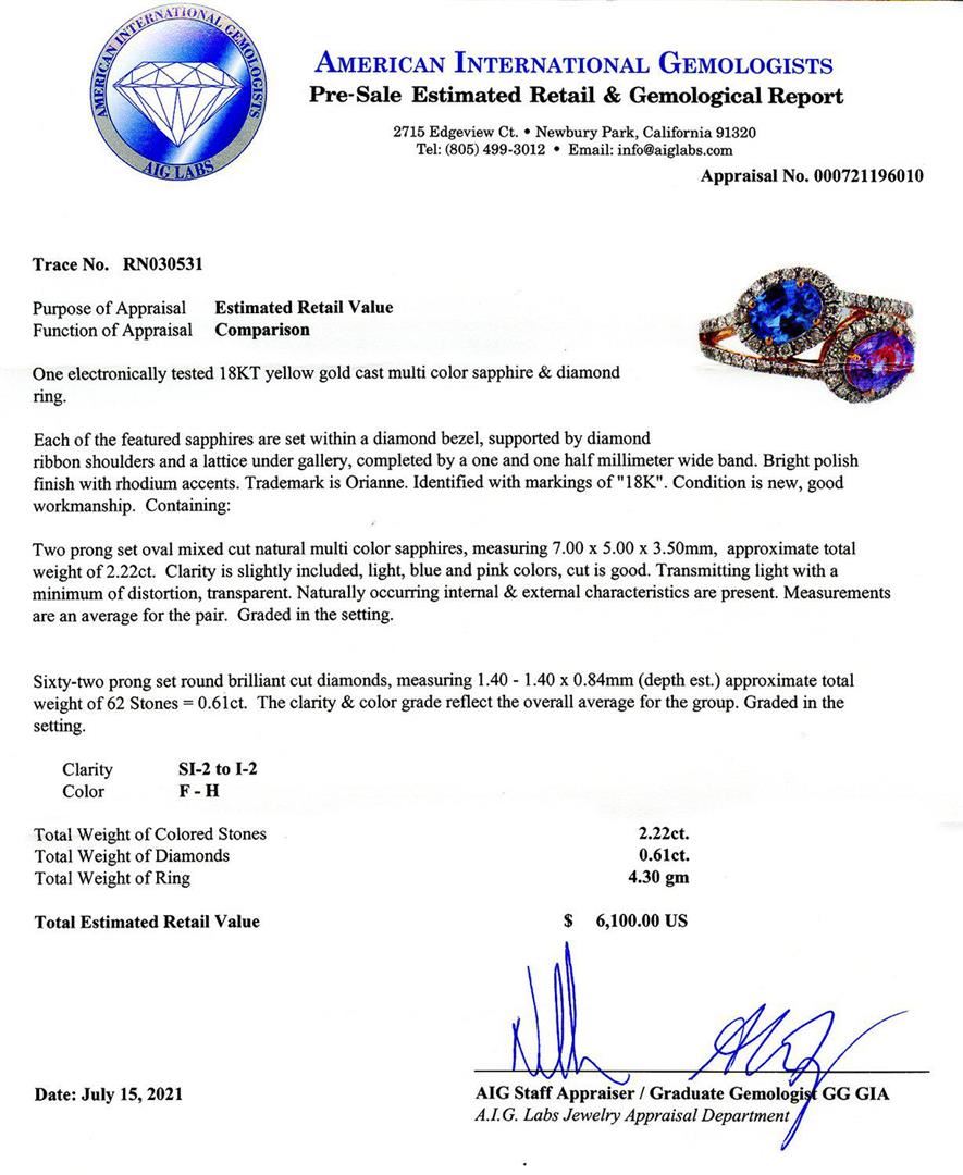 One electronically tested 18KT yellow gold cast multi color sapphire & diamond ring. Each of the featured sapphires are set within a diamond bezel, supported by diamond ribbon shoulders and a lattice under gallery, completed by a one and one half millimeter wide band. Bright polish finish with rhodium accents. Trademark is Orianne. Identified with markings of "18K". Condition is new, good workmanship. Containing: Two prong set oval mixed cut natural multi color sapphires, measuring 7.00 x 5.00 x 3.50mm, approximate total weight of 2.22ctw. Clarity is slightly included, light, blue and pink colors, cut is good. Transmitting light with a minimum of distortion, transparent. Naturally occurring internal & external characteristics are present. Measurements are an average for the pair. Graded in the setting. Sixty-two prong set round brilliant cut diamonds, measuring 1.40 - 1.40 x 0.84mm (depth est.) approximate total weight of 62 Stones = 0.61ctw. The clarity & color grade reflect the overall average for the group. Graded in the setting. Clarity SI2 to I2 Color F - H Total Weight of Colored Stones 2.22ctw. Total Weight of Diamonds 0.61ctw. Total Weight of Ring 4.30 gm