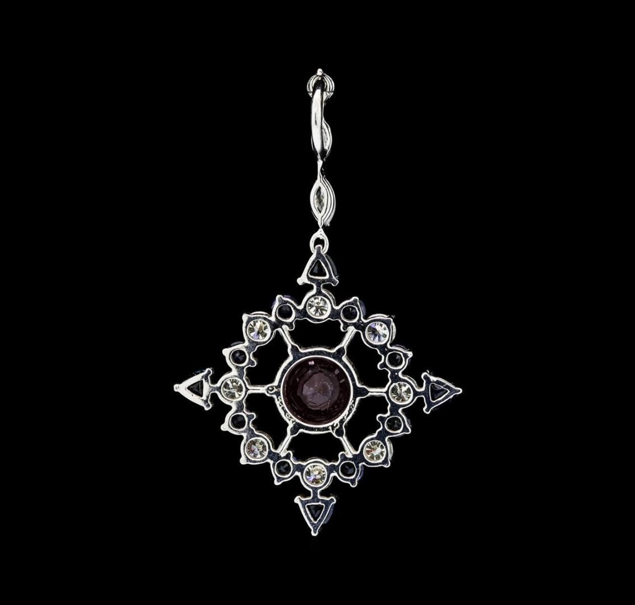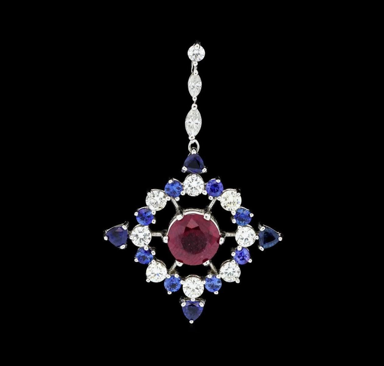 One electronically tested 14KT white gold lady's combination cast & assembled fashion pendant with a bright polish finish. The featured pendant has a starburst motif and a drop of approximately 41 millimeters. Condition is new, good workmanship. Containing: One prong set round modified mixed cut natural ruby, measuring 7.49 - 7.43 x 4.51 mm, (depth est.) approximate weight of 2.22ct., clarity is heavily included, medium, moderately strong, red color, (GIA R 5/4), cut is good. Transmitting light somewhat diffusely, semi-transparent to translucent. Naturally occurring internal & external characteristics are present. Indications of laboratory high temperature heat treatment, with glass & flux additives. Colored gemstones are presumed to have been subjected to commonly used enhancement processes. Graded in the setting. Four prong set triangle modified brilliant cut natural blue sapphires, measuring 3.30 x 3.20 x 2.08mm, (depth est.) approximate total weight of 0.64ct., clarity is eye clean, medium dark, very slightly grayish, blue color, (GIA B 6/3), cut is good. Transmitting light with no distortion, transparent. Colored gemstones are presumed to have been subjected to commonly used enhancement processes. Graded in the setting. Eight prong set round modified brilliant cut natural blue sapphires, measuring 2.50 - 2.40 x 1.59 mm, (depth est.) approximate total weight of 0.64ct., clarity is eye clean, medium light, moderately strong, blue color, (GIA B 4/4), cut is very good. Transmitting light with no distortion, transparent. Colored gemstones are presumed to have been subjected to commonly used enhancement processes. Graded in the setting. Two prong set marquise shaped cut diamonds, measuring 4.10 x 2.10 x 1.32mm (depth est.) approximate total weight of 2 Stones = 0.13ct. Graded in the setting. Color G - H Clarity VS-2 to SI-1 Cut Good Eight prong set round brilliant cut diamonds, measuring 3.10 - 3.00 x 1.89mm (depth est.) approximate total weight of 8 Stones = 0.86ct. Graded in the setting. Color H - I Clarity VS-2 to SI-1 Cut Good One prong set round brilliant cut diamond, measuring 2.40 - 2.35 x 1.48mm (depth est.) approximate weight of 0.05ct. Graded in the setting. Color H Clarity SI-1 Cut Very Good. Total Weight of Colored Stones 3.50ct.. Total Weight of Diamonds 1.04ct.. Total Weight of Pendant 3.40gm. GAS Appraised.