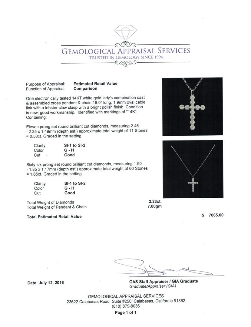 One electronically tested 14KT white gold lady's combination cast & assembled cross pendant & chain 18.0' long, 1.9mm oval cable link with a lobster claw clasp with a bright polish finish. Identified with markings of '14K'. Condition is new, good workmanship. Containing: Eleven prong set round brilliant cut diamonds, measuring 2.45 - 2.35 x 1.49mm (depth est.) approximate total weight of 11 Stones = 0.58ct. Graded in the setting. Clarity SI-1 to SI-2. Color: G - H Cut Good Sixty-Six prong set round brilliant cut diamonds, measuring 1.90 - 1.85 x 1.17mm (depth est.) approximate total weight of 66 Stones = 1.65ct. Graded in the setting. Clarity SI-1 to SI-2. Color: G - H Cut Good. Total Weight of Diamonds 2.23ct.. Total Weight of Pendant & Chain 7.00gm. GAS Appraised at $7,065.00.
