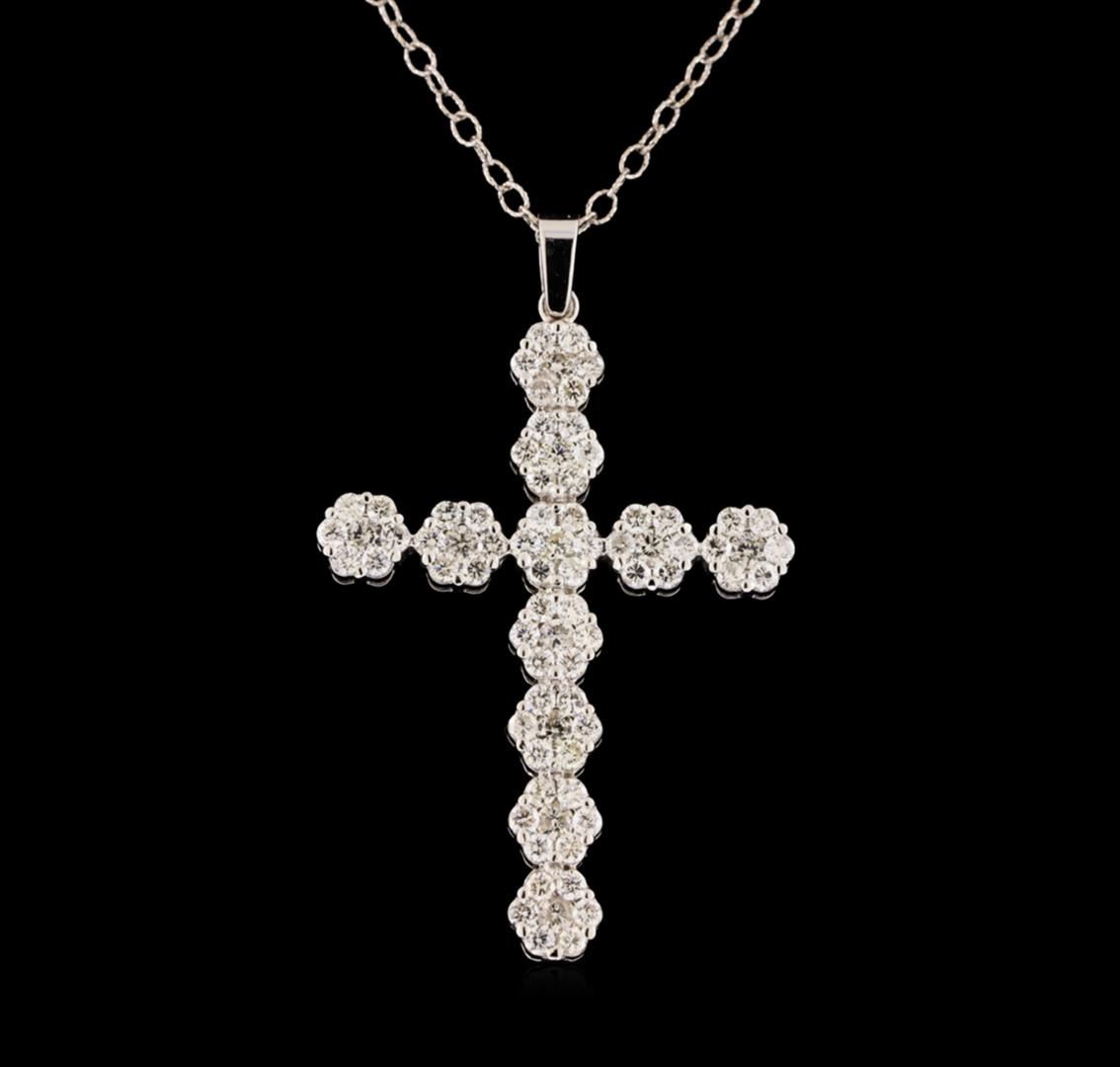 One electronically tested 14KT white gold lady's combination cast & assembled cross pendant & chain 18.0' long, 1.9mm oval cable link with a lobster claw clasp with a bright polish finish. Identified with markings of '14K'. Condition is new, good workmanship. Containing: Eleven prong set round brilliant cut diamonds, measuring 2.45 - 2.35 x 1.49mm (depth est.) approximate total weight of 11 Stones = 0.58ct. Graded in the setting. Clarity SI-1 to SI-2. Color: G - H Cut Good Sixty-Six prong set round brilliant cut diamonds, measuring 1.90 - 1.85 x 1.17mm (depth est.) approximate total weight of 66 Stones = 1.65ct. Graded in the setting. Clarity SI-1 to SI-2. Color: G - H Cut Good. Total Weight of Diamonds 2.23ct.. Total Weight of Pendant & Chain 7.00gm. GAS Appraised.