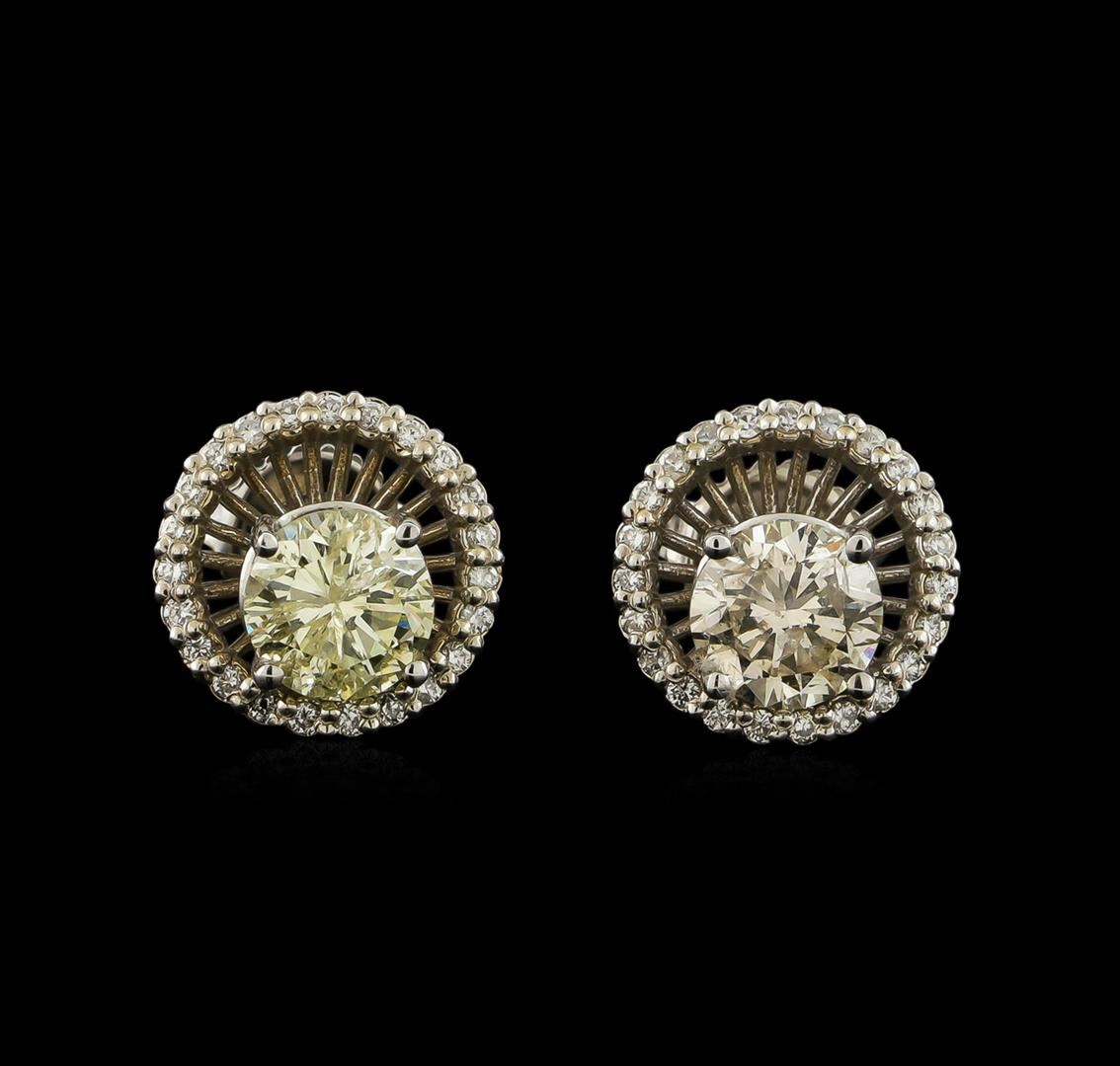 One pair electronically tested 14KT white gold cast & assembled diamond earrings with jackets. Each earring features a round diamond solitaire set within a diamond jacket. Standard backings. Bright polish finish Identified with markings of "14K". Condition is new, good workmanship. Containing: One prong set round brilliant cut diamond, measuring 6.37 - 6.30 x 3.90mm (depth est.), 3.00.%. GTCF approximate weight of 1.00ct. Graded in the setting. Clarity: I-2. Color: 61.5%. Table 59.9%. One prong set round brilliant cut diamond, measuring 6.30 - 6.25 x 4.00mm (depth est.), 3.00.%. GTCF approximate weight of 1.00ct with a medium strong blue fluorescence. Graded in the setting. Clarity: I-2. Color: M. Depth 63.7%. Table 63.4%. Forty-Six prong set round brilliant cut diamonds, measuring 1.15 - 1.10 x 0.69mm (depth est.) approximate total weight of 46 Stones = 0.24ct. Set & graded in the earring jackets. Clarity: VS-2 to SI-1. Color: H - I. Total Weight of Diamonds 2.24ct. Total Weight of Earrings With Jackets 3.32gm. AIG Appraised at $11,000.00.