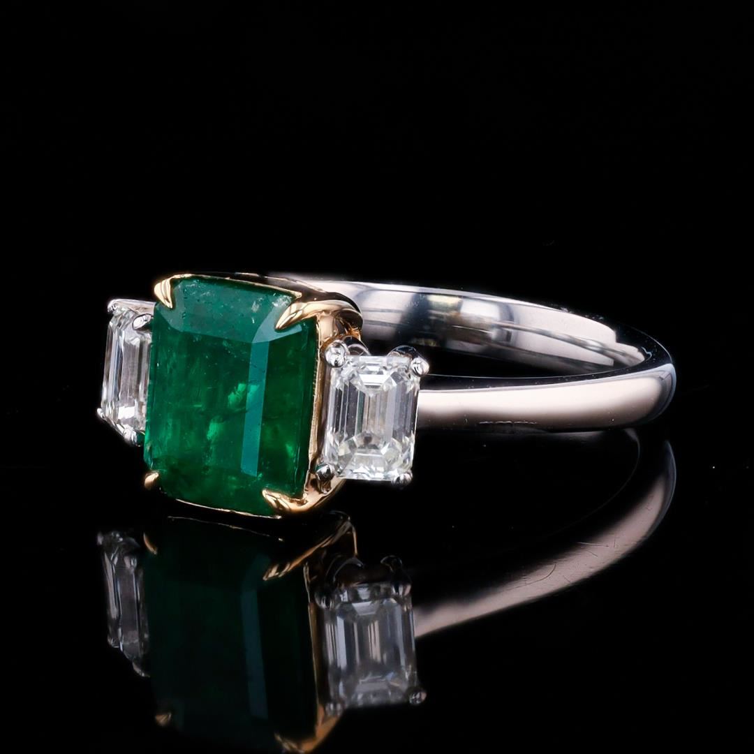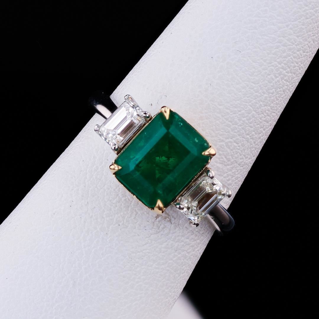Fourteen karat (14K) two tone gold natural emerald beryl and diamond ring. An octagonal step cut natural emerald beryl gemstone is mounted in the center of the ring. Two (2) emerald cut diamonds accent the ring on both sides of the center gemstone. The ring has a gross weight of 6.8 Grams. #NATURAL GEMSTONE# GEMSTONE: Emerald Beryl; NATURE: Natural; SHAPE: Octagonal Step, Faceted Cut; WEIGHT: 2.24 carat total; DIMENSIONS: 8.69 x 6.81mm; CLARITY: Type 3; COLOR: Green; SYMMETRY: Excellent; COLOR INTENSITY: Intense; TRANSPARENCY: Transparent; TONE: Dark #NATURAL DIAMOND# SHAPE: Emerald Cut; WEIGHT: 0.80 carat total (2pcs.); DIMENSIONS: 4.8 x 3.4mm; AVERAGE CLARITY: VS1-VS2; AVERAGE COLOR: F-G; SYMMETRY: Excellent; POLISH: Excellent #METAL# METAL: Gold; PURITY: 14K; COLOR: Two Tone (White & Yellow); CONDITION: Excellent; FINISH: High Polish #Size: 7