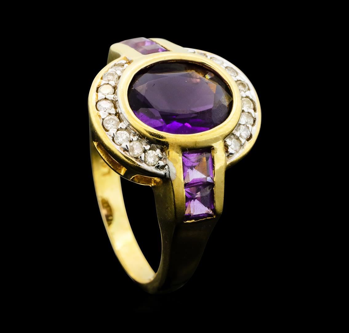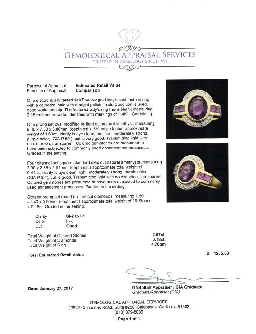 One electronically tested 14KT yellow gold lady's cast fashion ring with a cathedral halo with a bright polish finish. The featured lady's ring has a shank measuring 2.15 millimeters wide. Identified with markings of '14K'. Condition is used, good workmanship. Containing: One prong set oval modified brilliant cut natural amethyst, measuring 9.60 x 7.50 x 3.86mm, (depth est.) 5%. bulge factor, approximate weight of 1.63ct., clarity is eye clean, medium, moderately strong, purple color, (GIA P 5/4), cut is very good. Transmitting light with no distortion, transparent. Colored gemstones are presumed to have been subjected to commonly used enhancement processes. Graded in the setting. Four channel set square standard step cut natural amethysts, measuring 3.00 x 2.85 x 1.91mm, (depth est.) approximate total weight of 0.44ct., clarity is eye clean, light, moderately strong, purple color, (GIA P 3/4), cut is good. Transmitting light with no distortion, transparent. Colored gemstones are presumed to have been subjected to commonly used enhancement processes. Graded in the setting. Sixteen prong set round brilliant cut diamonds, measuring 1.50 - 1.40 x 0.90mm (depth est.) approximate total weight of 16 Stones = 0.18ct. Graded in the setting. Color I - J Clarity SI-2 to I-1 Cut Good. Total Weight of Colored Stones 2.07ct.. Total Weight of Diamonds 0.18ct.. Total Weight of Ring 4.70gm. GAS Appraised at $1,205.00.