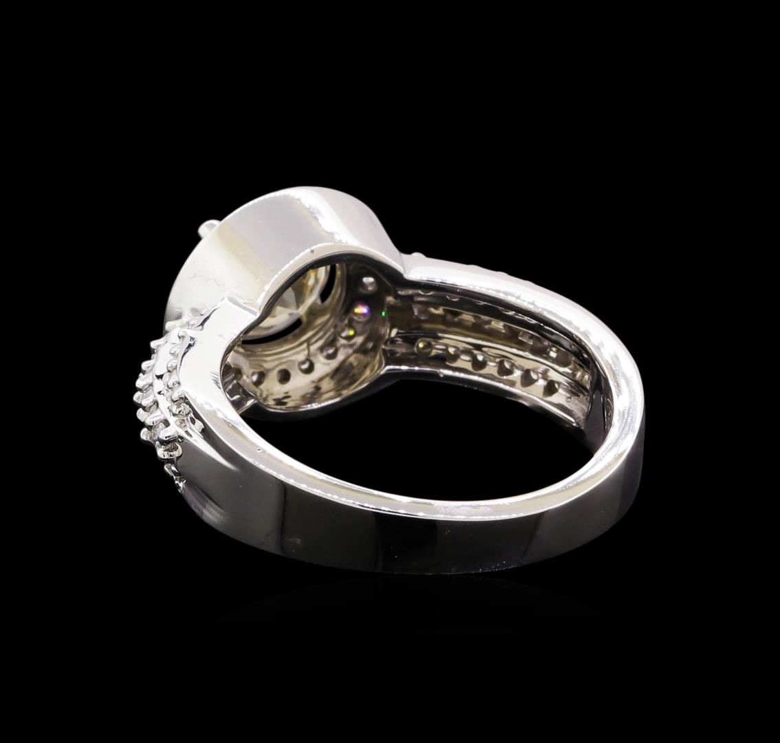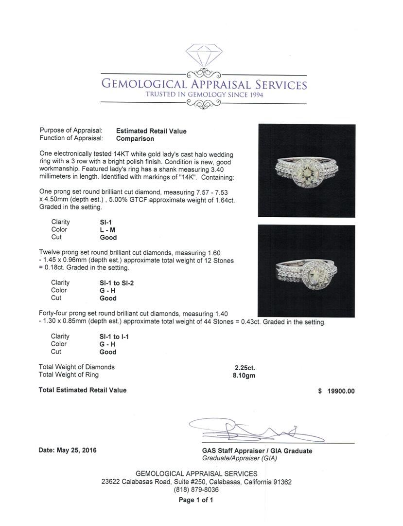 One electronically tested 14KT white gold lady's cast halo wedding ring with a 3 row with a bright polish finish. Featured lady's ring has a shank measuring 3.40 millimeters in width. Identified with markings of "14K". Condition is new, good workmanship. Containing: One prong set round brilliant cut diamond, measuring 7.57 - 7.53 x 4.50mm (depth est.) , 5.00.%. GTCF approximate weight of 1.64ct. Graded in the setting. Clarity: SI-1. Color: L - M. Cut Good Twelve prong set round brilliant cut diamonds, measuring 1.60 - 1.45 x 0.96mm (depth est.) approximate total weight of 12 Stones = 0.18ct. Graded in the setting. Clarity: SI-1 to SI-2. Color: G - Good Forty-Four prong set round brilliant cut diamonds, measuring 1.40 - 1.30 x 0.85mm (depth est.) approximate total weight of 44 Stones = 0.43ct. Graded in the setting. Clarity: SI-1 to I-1. Color: G - Good. Total Weight of Diamonds 2.25ct. Total Weight of Ring 8.10gm. GAS Appraised at $19,900.00.