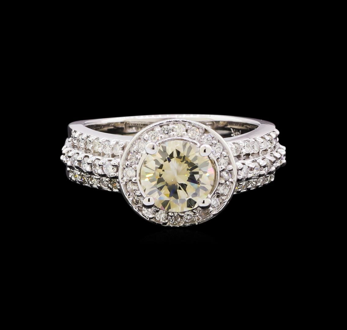 One electronically tested 14KT white gold lady's cast halo wedding ring with a 3 row with a bright polish finish. Featured lady's ring has a shank measuring 3.40 millimeters in width. Identified with markings of "14K". Condition is new, good workmanship. Containing: One prong set round brilliant cut diamond, measuring 7.57 - 7.53 x 4.50mm (depth est.) , 5.00.%. GTCF approximate weight of 1.64ct. Graded in the setting. Clarity: SI-1. Color: L - M. Cut Good Twelve prong set round brilliant cut diamonds, measuring 1.60 - 1.45 x 0.96mm (depth est.) approximate total weight of 12 Stones = 0.18ct. Graded in the setting. Clarity: SI-1 to SI-2. Color: G - Good Forty-Four prong set round brilliant cut diamonds, measuring 1.40 - 1.30 x 0.85mm (depth est.) approximate total weight of 44 Stones = 0.43ct. Graded in the setting. Clarity: SI-1 to I-1. Color: G - Good. Total Weight of Diamonds 2.25ct. Total Weight of Ring 8.10gm. GAS Appraised at $19,900.00.