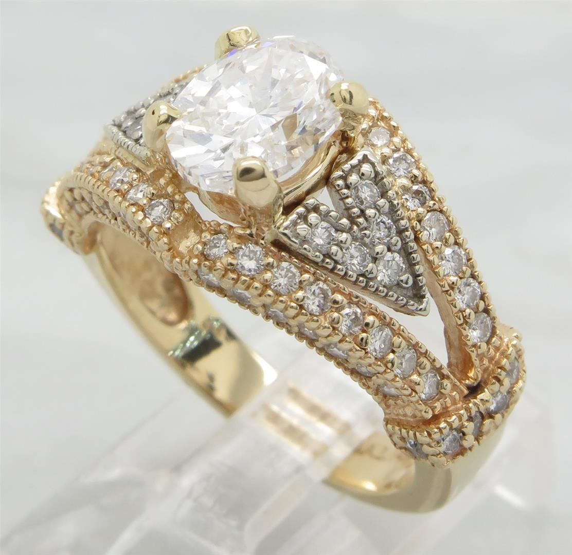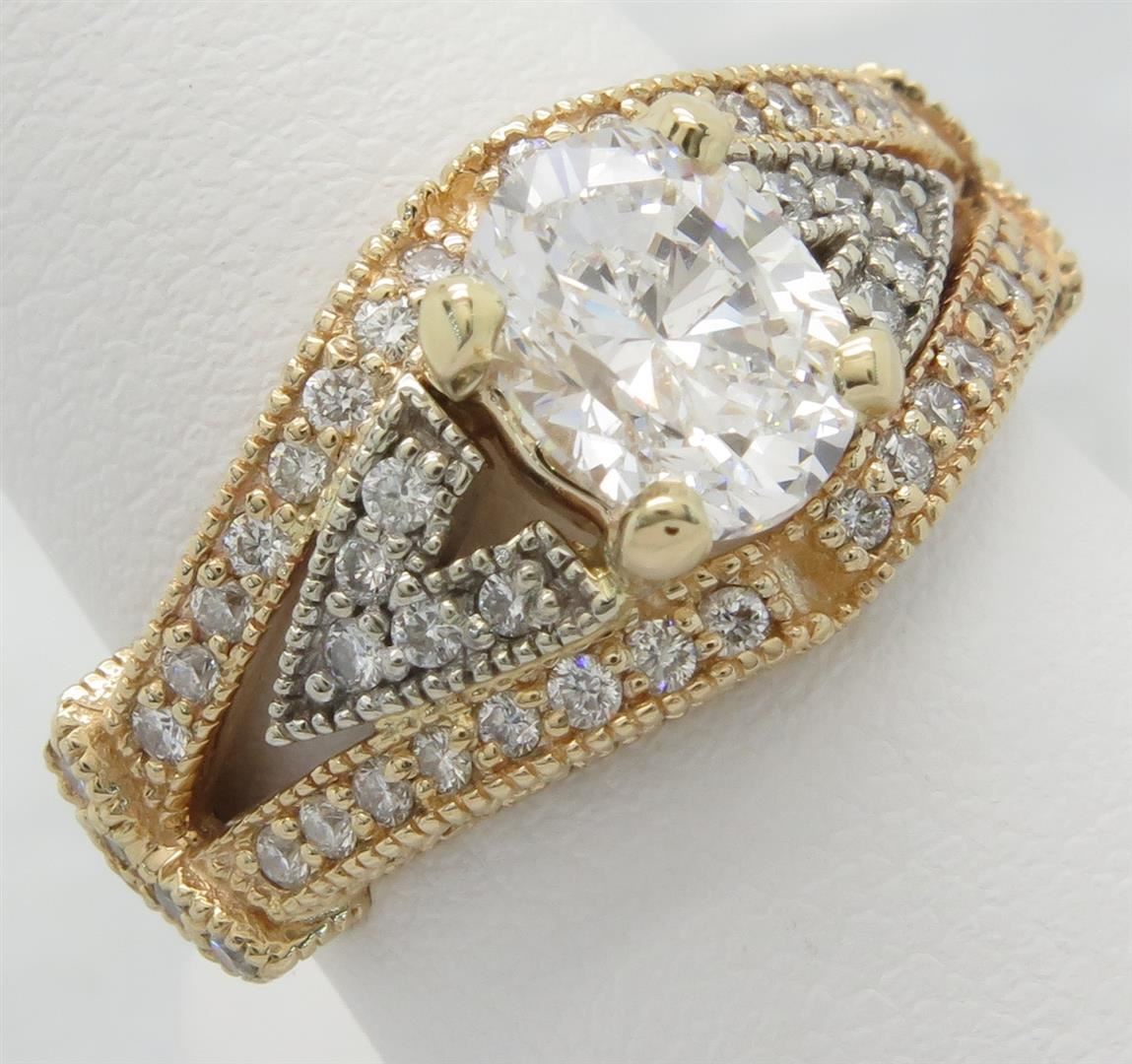 One tested 14K yellow gold diamond ring. Containing: One Oval Cut Diamond. Approximate Size: 1.40CT, Clarity: SI, Color: E-F. The diamond has been clarity enhanced (laser drilled). 82 Round Brilliant Cut Diamonds. Approximate total diamond weight: 2.25CTW. Diamonds are graded in the mounting, unless otherwise stated. Weight: 6.3 grams, Size: 7.0.