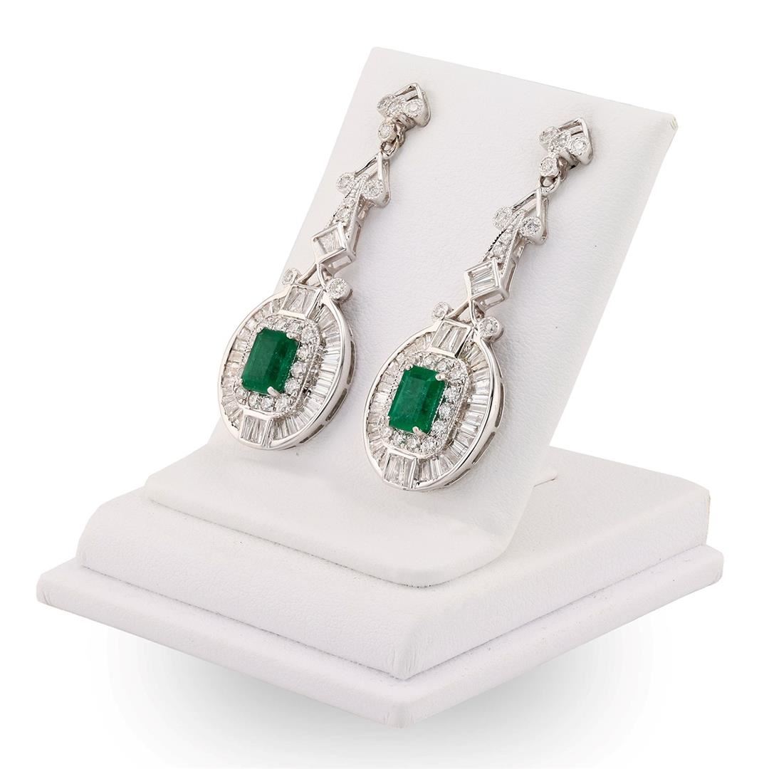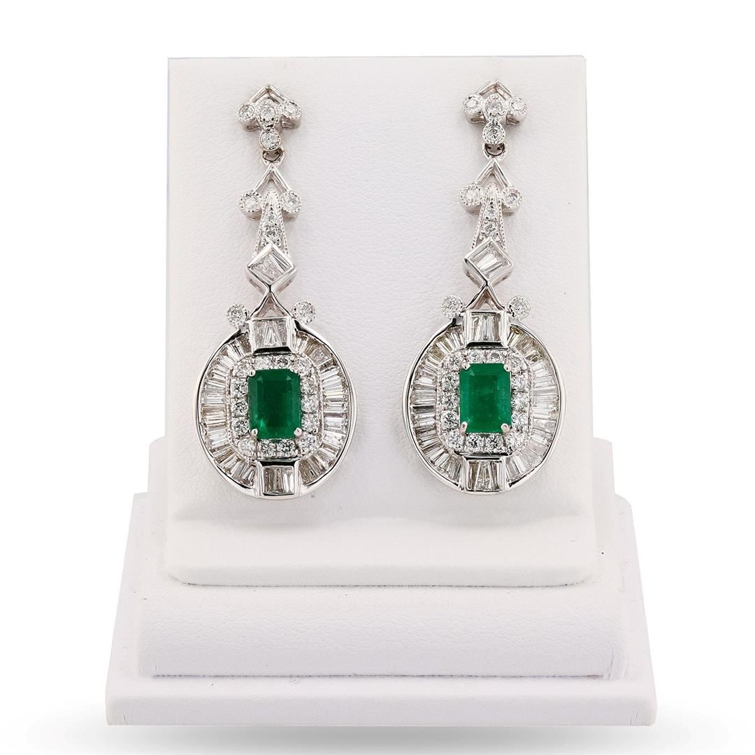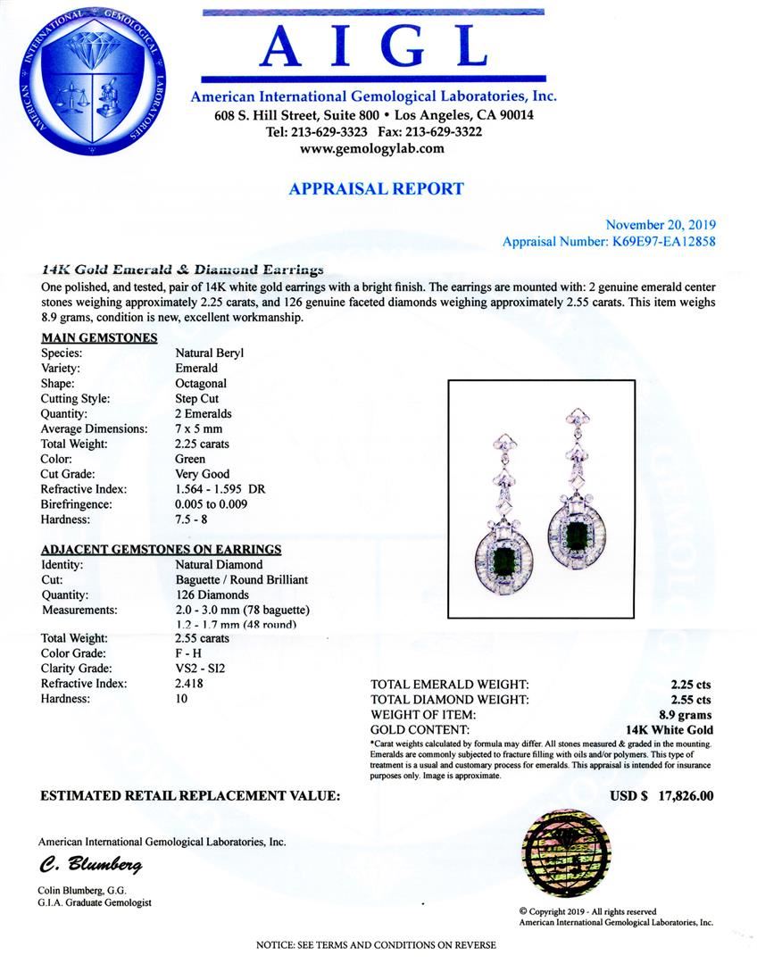 14K Gold Emerald and Diamond Earrings One polished, and tested, pair of 14K white gold earrings with a bright finish. The earrings are mounted with: 2 genuine emerald center stones weighing approximately 2.25 carats, and 126 genuine faceted diamonds weighing approximately 2.55 carats. This item weighs 8.9 grams, condition is new, excellent workmanship. MAIN GEMSTONES Species: Natural Beryl Variety: Emerald Shape: Octagonal Cutting Style: Step Cut Quantity: 2 Emeralds Average Dimensions: 7 x 5 mm Total Weight: 2.25 carats Color: Green Cut Grade: Very Good Refractive Index: 1.564 - 1.595 DR Birefringence: 0.005 to 0.009 Hardness: 7.5 - 8 ADJACENT GEMSTONES ON EARRINGS, Identity: Natural Diamond Cut: Baguette / Round Brilliant Quantity: 126 Diamonds Measurements: 2.0 - 3.0 mm (78 baguette) 1.2 - 1.7 mm (48 round) Total Weight: 2.55 carats Color Grade: F-H Clarity Grade: VS-2 to SI-2 Refractive Index: 2.418 Hardness: 10 TOTAL EMERALD WEIGHT: 2.25 cts TOTAL DIAMOND WEIGHT: 2.55 cts WEIGHT OF ITEM: 8.9 grams GOLD CONTENT: 14K White Gold