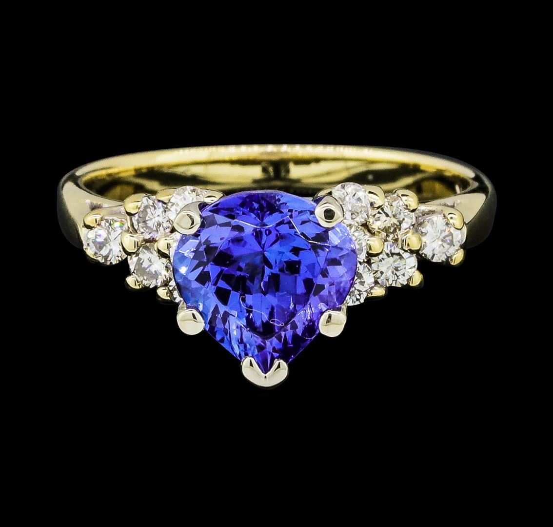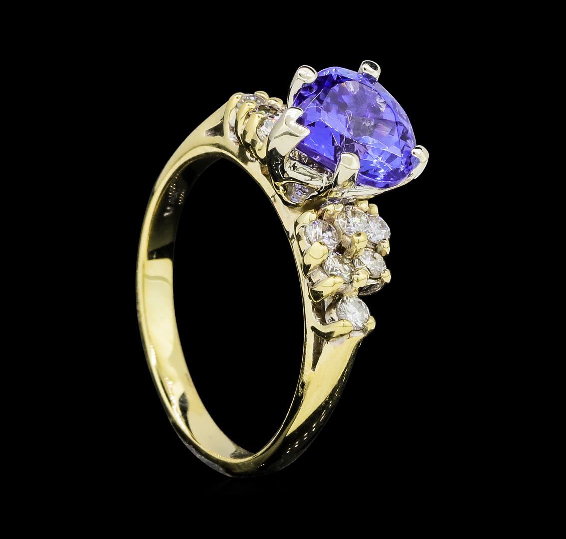 One electronically tested 14KT yellow and white gold lady's combination cast & assembled fashion ring with a cathedral shank with a bright polish finish. The featured lady's ring has a shank measuring 2.27 millimeters wide. Identified with markings of '14K'. Condition is new, good workmanship. Containing: One prong set pear modified brilliant cut natural tanzanite, measuring 8.20 x 8.22 x 5.34mm, (depth est.) approximate weight of 2.25ct., clarity is eye clean, medium, very slightly grayish, bluish violet color, (GIA bV 5/3), cut is good. Transmitting light with no distortion, transparent. Colored gemstones are presumed to have been subjected to commonly used enhancement processes. Graded in the setting. Twelve prong set round brilliant cut diamonds, measuring 2.10 - 2.00 x 1.27mm (depth est.) approximate total weight of 12 Stones = 0.40ct. Graded in the setting. Color H - I Clarity SI-1 to SI-2 Cut Good. Total Weight of Colored Stones 2.25ct.. Total Weight of Diamonds 0.40ct.. Total Weight of Ring 4.40gm GAS Appraised at $3590.00. GAS Appraised at $3,590.00.