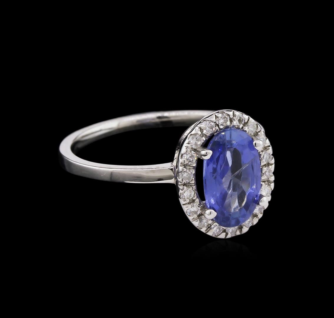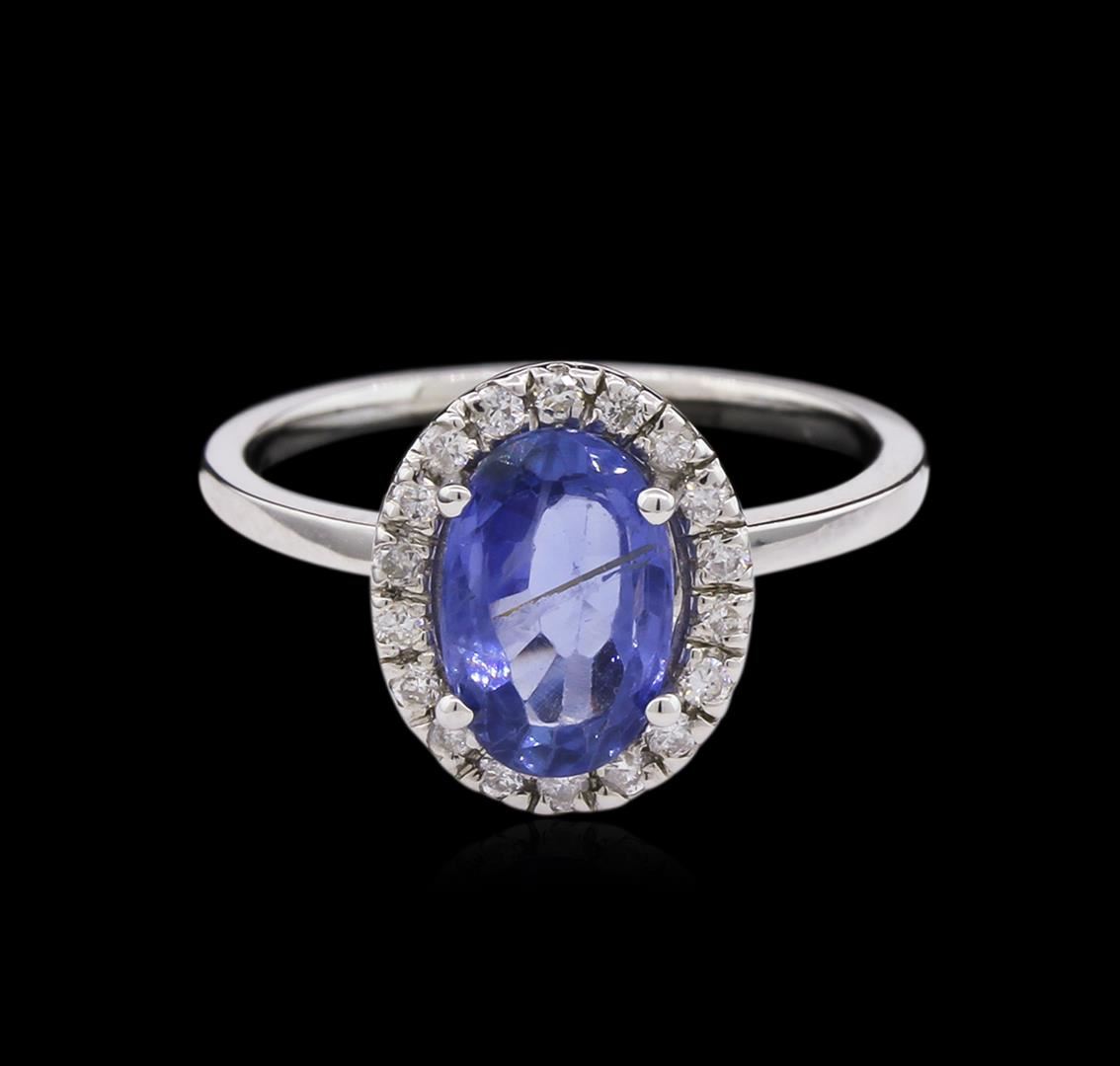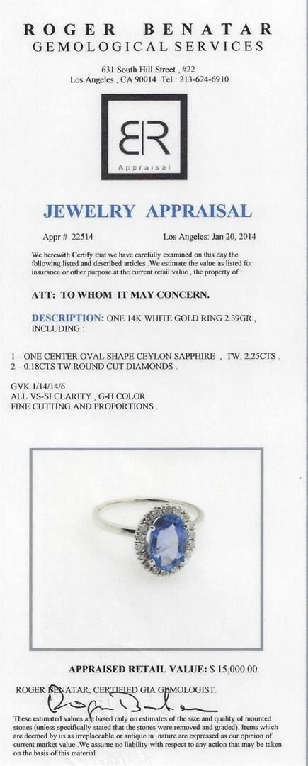 One 14KT White Gold ring 2.39GR, Including: one center oval shape ceylon sapphire, Tw : 2.25CTS. 0.18CTS TW round cut diamonds. All VS-SI Clarity, G-H Color Fine Cutting and Proportions. RBGS Appraised at $15,000.00.