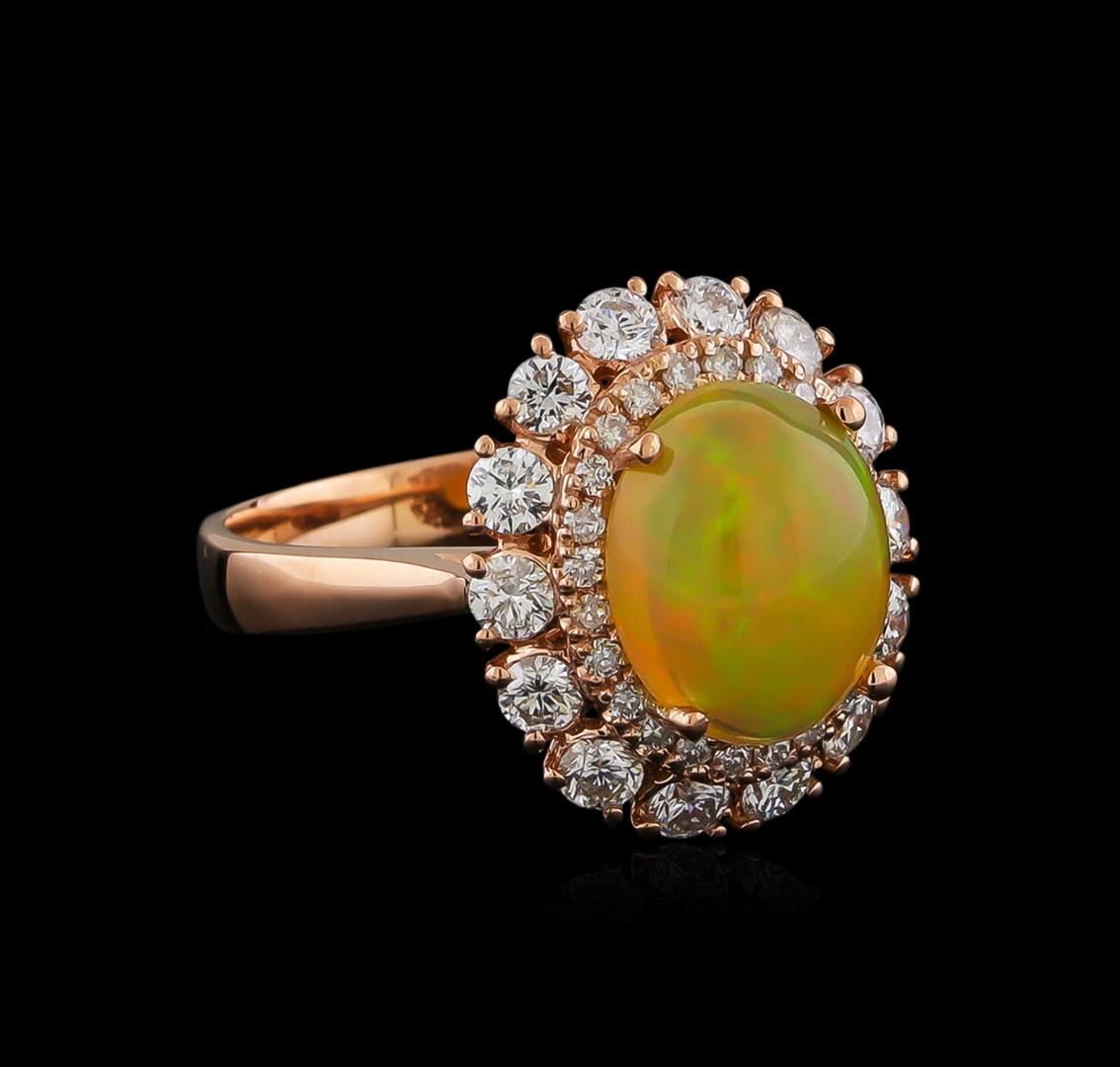 One electronically tested 14KT rose gold lady's cast fashion ring with a double basket halo with a bright polish finish. The featured lady's ring has a shank measuring 2.99 millimeters wide. Identified with markings of "K14". Condition is new, good workmanship. Containing: One orange crystal that is cut in a oval shaped cabochon and is prong set, measuring 10.99 mm long x 8.97 mm wide, and 4.65 mm thick and the approximate weight is 2.27 carats. The opal has a somewhat bright, green-orange play of color (fire) in a rolling flashfire pattern; a medium dome; a good cut; no inclusions; consistent in its brightness and pattern; and is not directional. Graded in the setting. Fourteen prong set round brilliant cut diamonds, measuring 2.60 - 2.55 x 1.57mm (depth est.) approximate total weight of 14 Stones = 0.90ct. Graded in the setting. Clarity: SI-1 to SI-2. Color: G - Very Good Twenty-Four prong set round brilliant cut diamonds, measuring 1.35 - 1.25 x 0.81mm (depth est.) approximate total weight of 24 Stones = 0.20ct. Graded in the setting. Clarity: SI-2 to I-1. Color: H - I. Cut Good. Total Weight of Diamonds 1.10ct. Total Weight of Opals 2.27ct. Total Weight of Ring 5.10gm. GAS Appraised at $4,440.00.