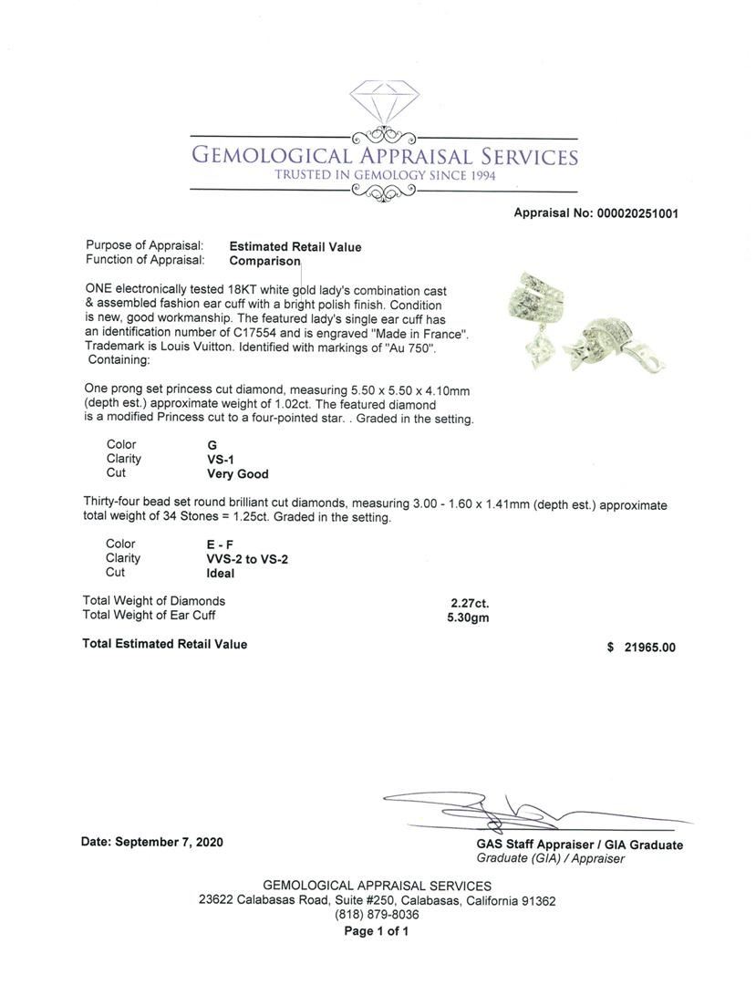 One prong set princess cut diamond, measuring 5.50 x 5.50 x 4.10mm (depth est.) approximate weight of 1.02ct. The featured diamond is a modified Princess cut to a four-pointed star. Graded in the setting. Color G Clarity VS-1 Cut Very Good Thirty-Four bead set round brilliant cut diamonds, measuring 3.00 - 1.60 x 1.41mm (depth est.) approximate total weight of 34 Stones = 1.25ct. Graded in the setting. Color E - F Clarity VVS-2 to VS-2 Cut Ideal. Total Weight of Diamonds 2.27ct.. Total Weight of Ear Cuff 5.30gm GAS Appraised at $21965.00. GAS Appraised.