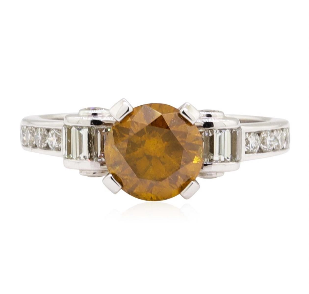 One electronically tested 18KT white gold lady's cast fashion ring with a bright polish finish. The featured lady's ring has a shank measuring 2.25 millimeters wide. Identified with markings of '18K'. Condition is new, good workmanship. Containing: One prong set round brilliant cut diamond, measuring 7.41 - 7.34 x 4.57mm (depth est.) approximate weight of 1.55ct. Graded loose prior to setting in the GIA Laboratory, Report #2141737931. Color Fancy Deep Brownish Orangy Yellow Clarity SI-2 Cut Excellent Six channel set baguette cut diamonds, measuring from 2.60 x 1.80 x 1.53mm (depth est.) to 2.70 x 2.00 x 1.70mm (depth est.) approximate total weight of 6 Stones = 0.45ct. Graded in the setting. Color G - H Clarity VS-1 to VS-2 Cut Very Good Ten channel set round brilliant cut diamonds, measuring 2.00 - 1.90 x 1.17mm (depth est.) approximate total weight of 10 Stones = 0.27ct. Graded in the setting. Color G - H Clarity VS-1 to SI-1 Cut Very Good. Total Weight of Diamonds 2.27ct.. Total Weight of Ring 4.50gm GAS Appraised at $18940.00. GAS Appraised.