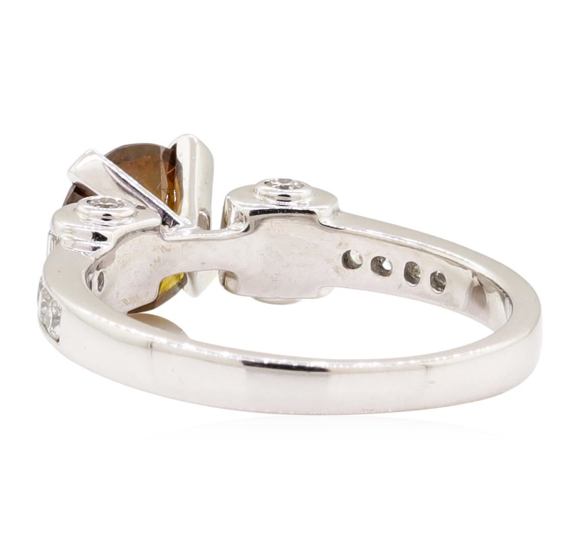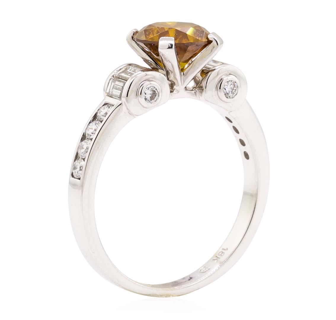 One electronically tested 18KT white gold lady's cast fashion ring with a bright polish finish. The featured lady's ring has a shank measuring 2.25 millimeters wide. Identified with markings of '18K'. Condition is new, good workmanship. Containing: One prong set round brilliant cut diamond, measuring 7.41 - 7.34 x 4.57mm (depth est.) approximate weight of 1.55ct. Graded loose prior to setting in the GIA Laboratory, Report #2141737931. Color Fancy Deep Brownish Orangy Yellow Clarity SI-2 Cut Excellent Six channel set baguette cut diamonds, measuring from 2.60 x 1.80 x 1.53mm (depth est.) to 2.70 x 2.00 x 1.70mm (depth est.) approximate total weight of 6 Stones = 0.45ct. Graded in the setting. Color G - H Clarity VS-1 to VS-2 Cut Very Good Ten channel set round brilliant cut diamonds, measuring 2.00 - 1.90 x 1.17mm (depth est.) approximate total weight of 10 Stones = 0.27ct. Graded in the setting. Color G - H Clarity VS-1 to SI-1 Cut Very Good. Total Weight of Diamonds 2.27ct.. Total Weight of Ring 4.50gm GAS Appraised at $18940.00. GAS Appraised.