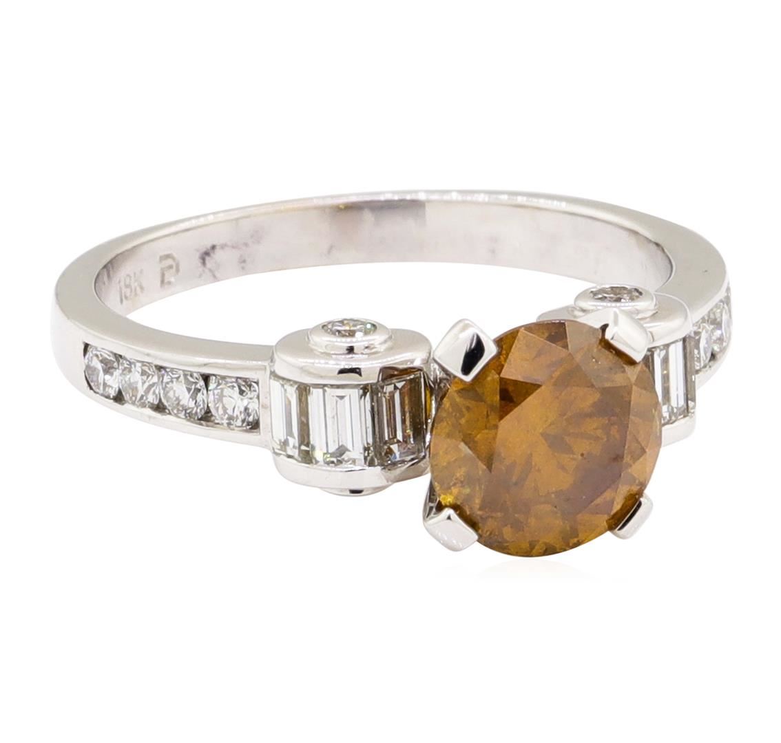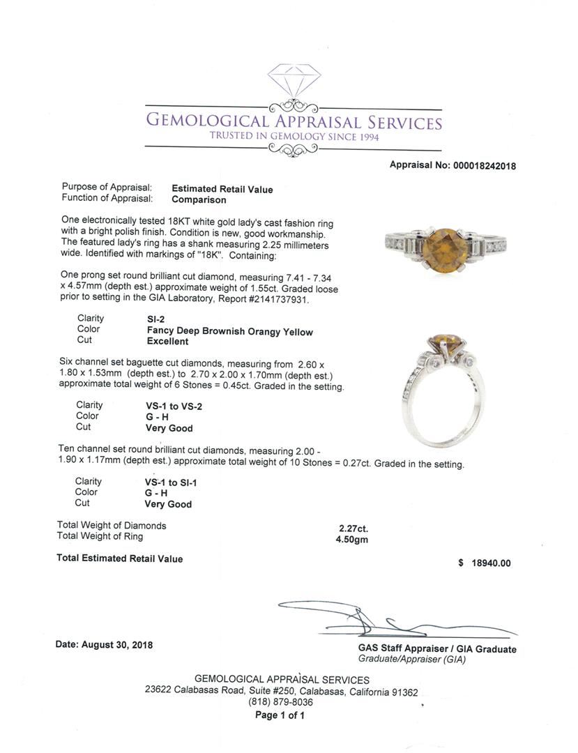 One electronically tested 18KT white gold lady's cast fashion ring with a bright polish finish. The featured lady's ring has a shank measuring 2.25 millimeters wide. Identified with markings of '18K'. Condition is new, good workmanship. Containing: One prong set round brilliant cut diamond, measuring 7.41 - 7.34 x 4.57mm (depth est.) approximate weight of 1.55ct. Graded loose prior to setting in the GIA Laboratory, Report #2141737931. Color Fancy Deep Brownish Orangy Yellow Clarity SI-2 Cut Excellent Six channel set baguette cut diamonds, measuring from 2.60 x 1.80 x 1.53mm (depth est.) to 2.70 x 2.00 x 1.70mm (depth est.) approximate total weight of 6 Stones = 0.45ct. Graded in the setting. Color G - H Clarity VS-1 to VS-2 Cut Very Good Ten channel set round brilliant cut diamonds, measuring 2.00 - 1.90 x 1.17mm (depth est.) approximate total weight of 10 Stones = 0.27ct. Graded in the setting. Color G - H Clarity VS-1 to SI-1 Cut Very Good. Total Weight of Diamonds 2.27ct.. Total Weight of Ring 4.50gm GAS Appraised at $18940.00. GAS Appraised.
