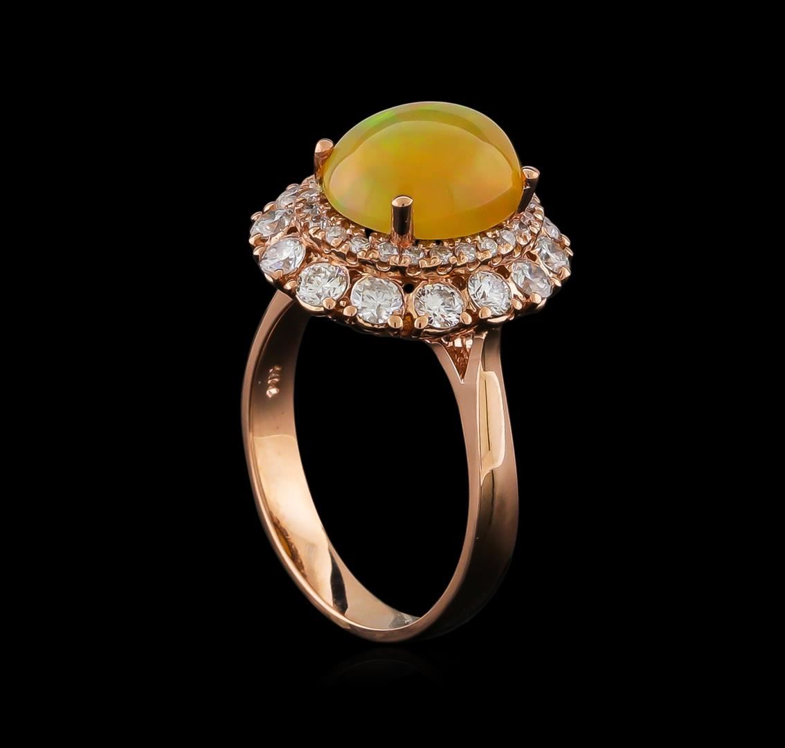 One electronically tested 14KT rose gold lady's cast fashion ring with a double basket halo with a bright polish finish. The featured lady's ring has a shank measuring 2.99 millimeters wide. Identified with markings of "K14". Condition is new, good workmanship. Containing: One orange crystal that is cut in a oval shaped cabochon and is prong set, measuring 10.99 mm long x 8.97 mm wide, and 4.65 mm thick and the approximate weight is 2.27 carats. The opal has a somewhat bright, green-orange play of color (fire) in a rolling flashfire pattern; a medium dome; a good cut; no inclusions; consistent in its brightness and pattern; and is not directional. Graded in the setting. Fourteen prong set round brilliant cut diamonds, measuring 2.60 - 2.55 x 1.57mm (depth est.) approximate total weight of 14 Stones = 0.90ct. Graded in the setting. Clarity: SI-1 to SI-2. Color: G - Very Good Twenty-Four prong set round brilliant cut diamonds, measuring 1.35 - 1.25 x 0.81mm (depth est.) approximate total weight of 24 Stones = 0.20ct. Graded in the setting. Clarity: SI-2 to I-1. Color: H - I. Cut Good. Total Weight of Diamonds 1.10ct. Total Weight of Opals 2.27ct. Total Weight of Ring 5.10gm. GAS Appraised at $4,440.00.