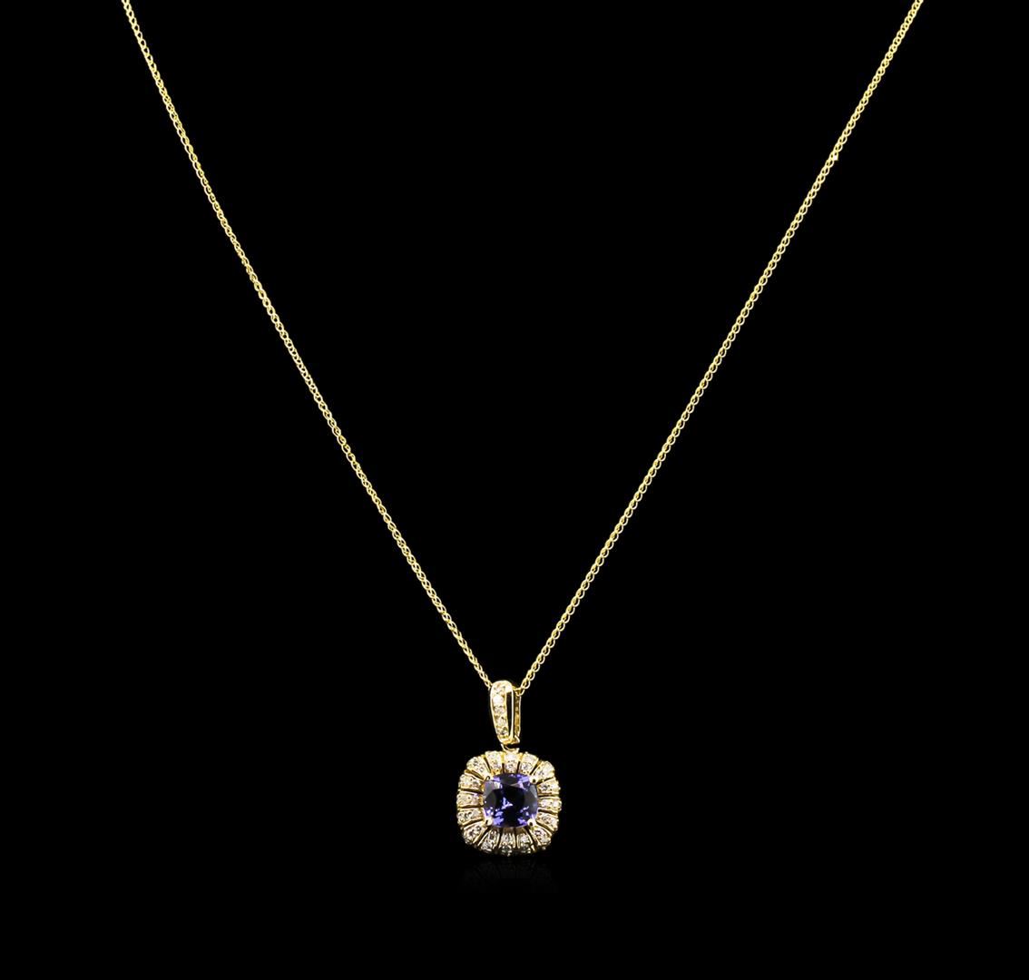 One electronically tested 14KT yellow gold lady's combination cast & assembled fashion pendant & chain 18.0" long, 1mm loose rope chain with a spring ring clasp with a halo with a bright polish finish. Identified with markings of "14K". Condition is new, good workmanship. Containing: One prong set square cushion modified brilliant cut natural tanzanite, measuring 7.82 x 7.79 x 5.00mm, approximate weight of 2.27ct., clarity is eye clean, type I, medium, very slightly grayish, bluish violet color, (GIA bV 5/3), cut is good. Transmitting light with no distortion, transparent. Colored gemstones are presumed to have been subjected to commonly used enhancement processes. Graded in the setting. Fifty-Three prong set round brilliant cut diamonds, measuring 1.50 - 1.35 x 0.93mm (depth est.) approximate total weight of 53 Stones = 0.61ct. Graded in the setting. Clarity: SI-2 to I-1. Color: H - I. Cut Good. Total Weight of Colored Stones 2.27ct. Total Weight of Diamonds 0.61ct. Total Weight of Pendant & Chain 5.10gm. GAS Appraised at $5,160.00.