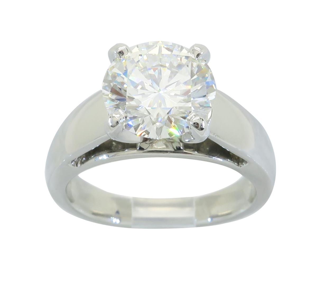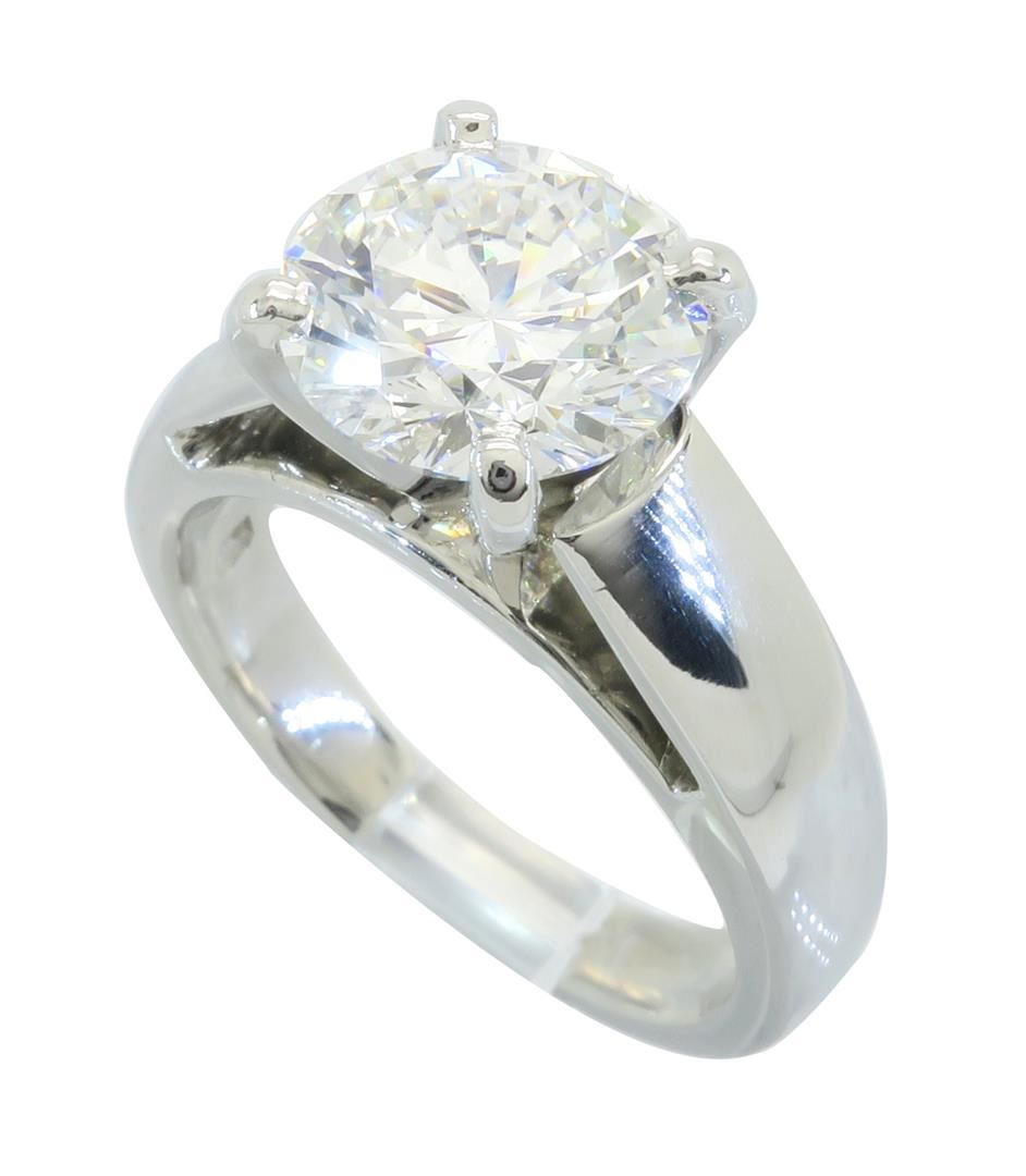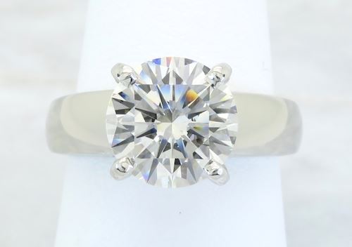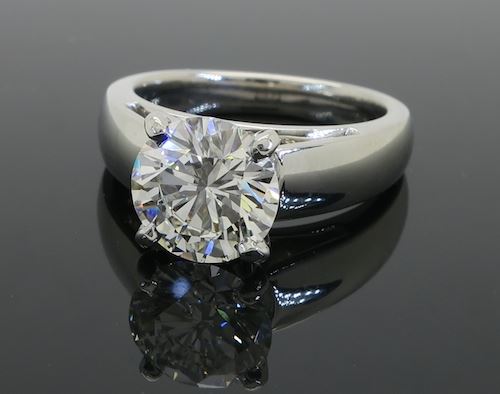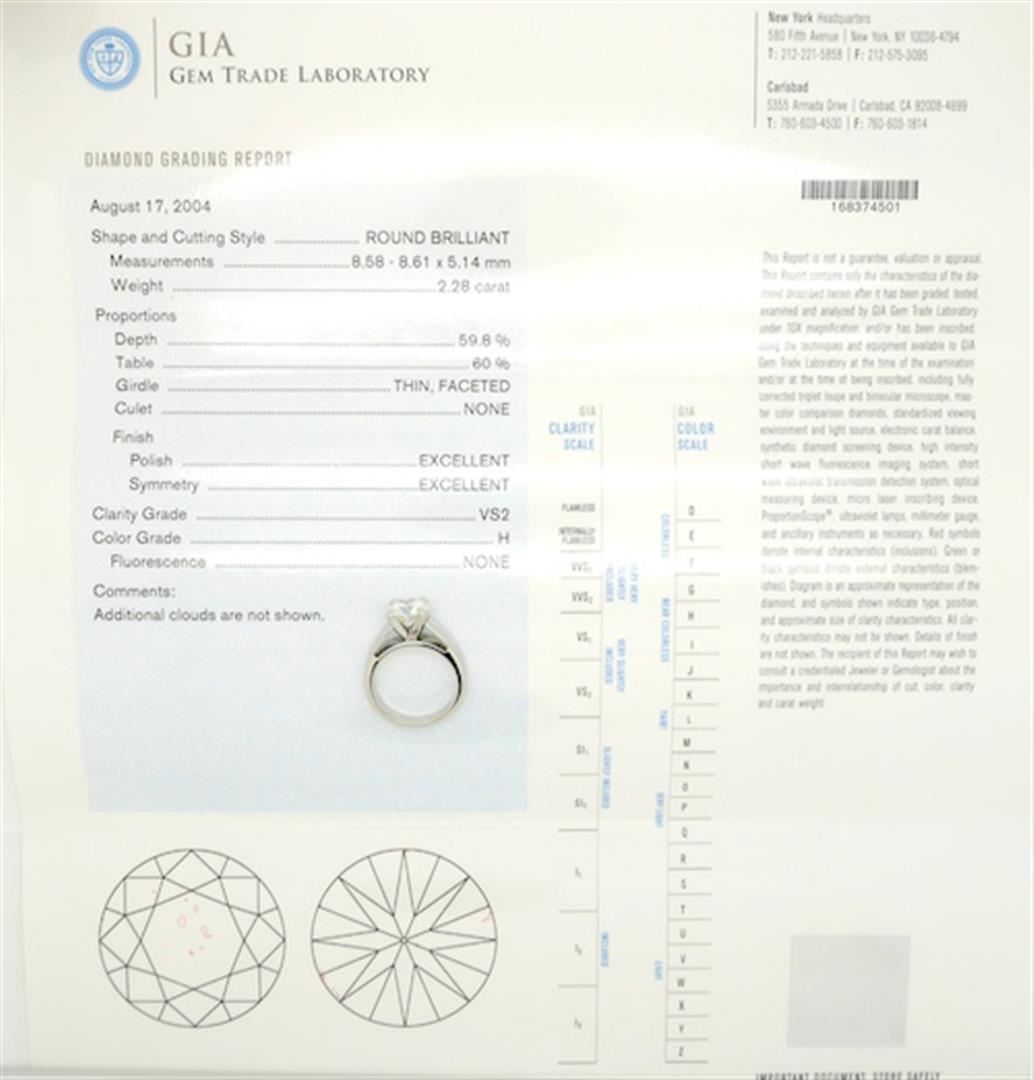 One tested Platinum diamond ring. Containing: 1 GIA Certified Round Brilliant Cut Diamonds. Diamond Weight: 2.28 CT Clarity: VS2, Color: H. All diamonds are graded in the mounting unless otherwise stated. Weight of ring: 11.4 grams, Size of ring: 6