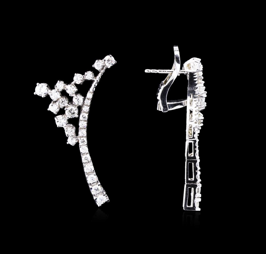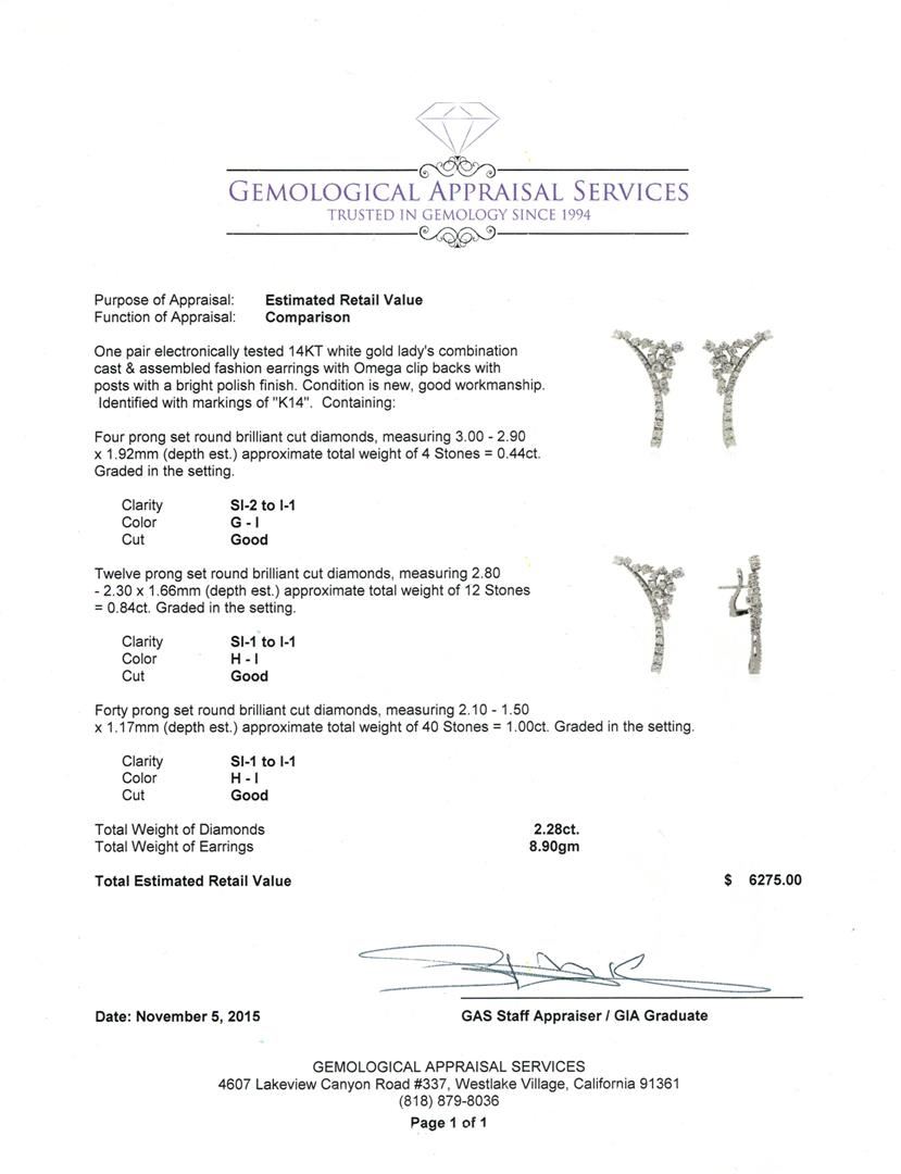 One pair electronically tested 14KT white gold lady's combination cast & assembled fashion earrings with Omega clip backs with posts with a bright polish finish. Identified with markings of "K14". Condition is new, good workmanship. Containing: Four prong set round brilliant cut diamonds, measuring 3.00 - 2.90 x 1.92mm (depth est.) approximate total weight of 4 Stones = 0.44ct. Graded in the setting. Clarity: SI-2 to I-1. Color: G - I. Cut Good Twelve prong set round brilliant cut diamonds, measuring 2.80 - 2.30 x 1.66mm (depth est.) approximate total weight of 12 Stones = 0.84ct. Graded in the setting. Clarity: SI-1 to I-1. Color: H - I. Cut Good Forty prong set round brilliant cut diamonds, measuring 2.10 - 1.50 x 1.17mm (depth est.) approximate total weight of 40 Stones = 1.00ct. Graded in the setting. Clarity: SI-1 to I-1. Color: H - I. Cut Good. Total Weight of Diamonds 2.28ct. Total Weight of Earrings 8.90gm. GAS Appraised at $6,275.00.