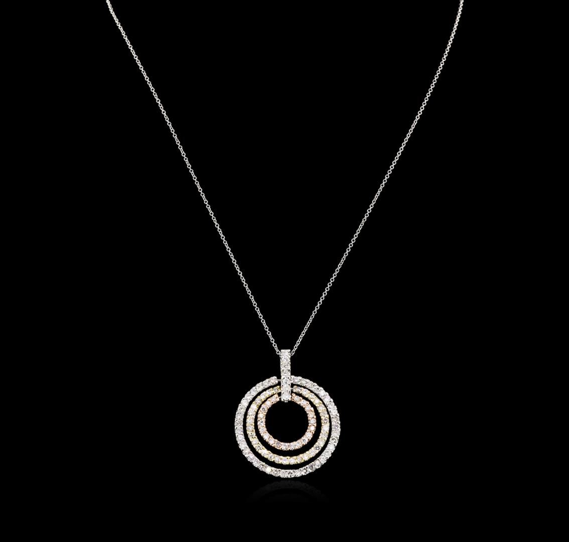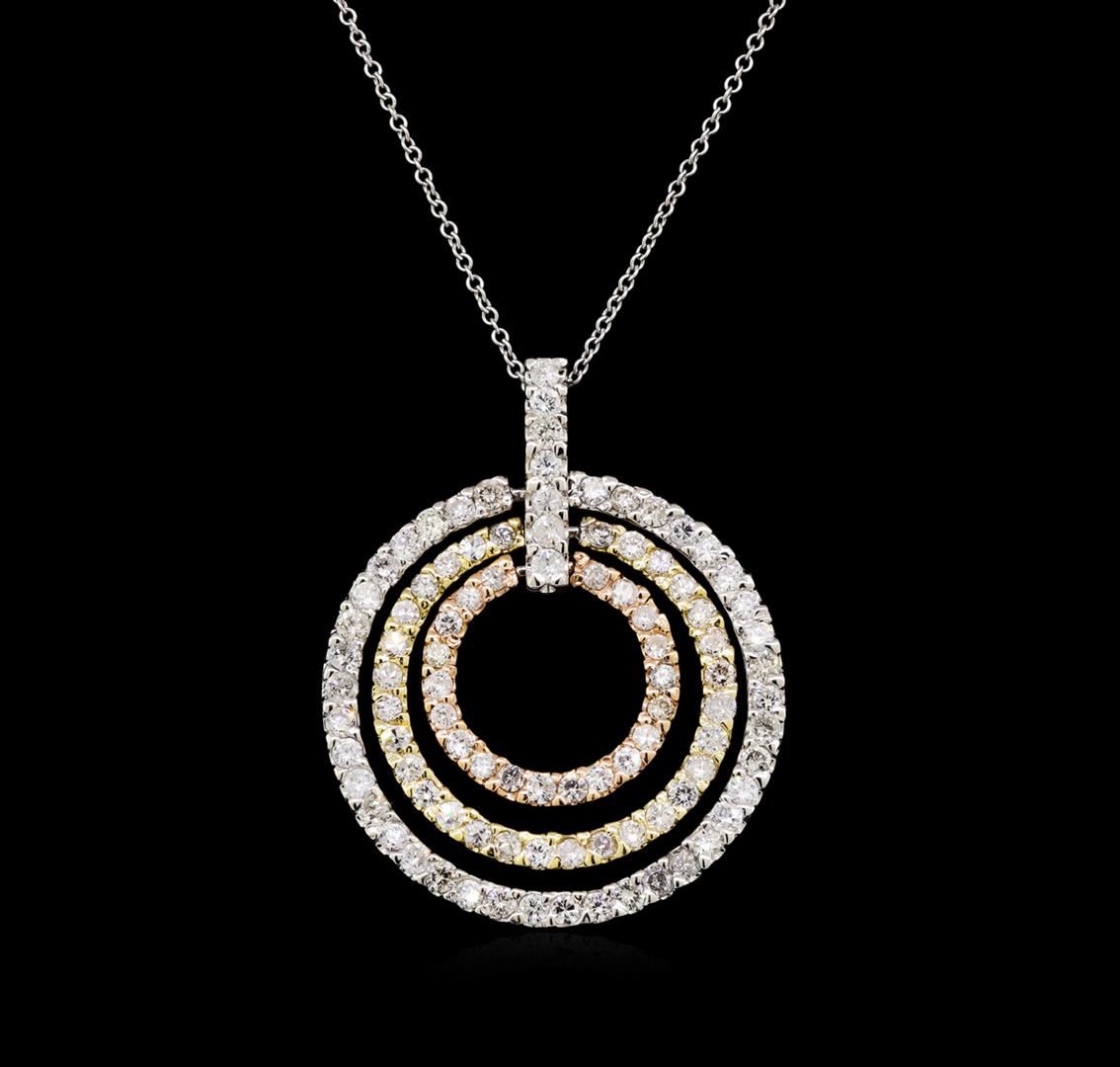 One electronically tested 14KT white, yellow and rose gold ladies cast & assembled diamond pendant with chain. The pendant features three concentric diamond rings completed by a white gold diamond ribbon bail. The innermost ring is rose gold, the middle ring is yellow gold, and the outermost ring is white gold. The pendant is supported by a sixteen inch length 14KT white gold designer style chain, terminating in a spring ring clasp. Bright polish finish. Identified with markings of "14K". Condition is new, good workmanship. Containing: Forty-Six prong set round brilliant and single cut diamonds, measuring 2.00 x 1.80 x 0.00mm (depth est.) approximate total weight of 46 Stones = 1.25ct. Graded in the setting. Clarity: SI-2 to I-2. Color: H - J Thirty prong set round brilliant and single cut diamonds, measuring 1.80 x 1.70 x 0.00mm (depth est.) approximate total weight of 30 Stones = 0.68ct. Graded in the setting. Clarity: SI-2 to I-2. Color: H - J Twenty prong set round brilliant and single cut diamonds, measuring 1.60 x 1.50 x 0.00mm (depth est.) approximate total weight of 20 Stones = 0.35ct. Graded in the setting. Clarity: SI-1 to I-2. Color: H - J. Total Weight of Diamonds 2.28ct. Total Weight of Pendant With Chain 8.18gm. AIG Appraised at $6,485.00.