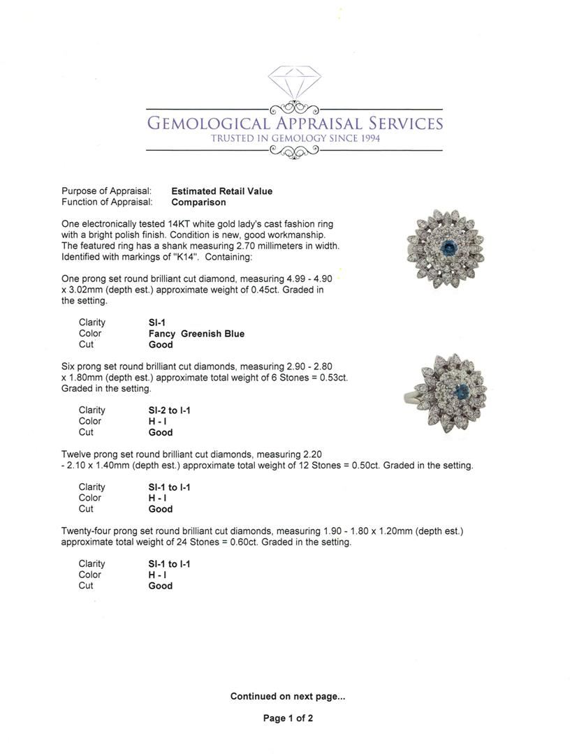 One electronically tested 14KT white gold lady's cast fashion ring with a bright polish finish. The featured ring has a shank measuring 2.70 millimeters in width. Identified with markings of "K14". Condition is new, good workmanship. Containing: One prong set round brilliant cut diamond, measuring 4.99 - 4.90 x 3.02mm (depth est.) approximate weight of 0.45ct. Graded in the setting. Clarity: SI-1 Cut Good Six prong set round brilliant cut diamonds, measuring 2.90 - 2.80 x 1.80mm (depth est.) approximate total weight of 6 Stones = 0.53ct. Graded in the setting. Clarity: SI-2 to I-1. Color: H - I. Cut Good Twelve prong set round brilliant cut diamonds, measuring 2.20 - 2.10 x 1.40mm (depth est.) approximate total weight of 12 Stones = 0.50ct. Graded in the setting. Clarity: SI-1 to I-1. Color: H - I. Cut Good Twenty-Four prong set round brilliant cut diamonds, measuring 1.90 - 1.80 x 1.20mm (depth est.) approximate total weight of 24 Stones = 0.60ct. Graded in the setting. Clarity: SI-1 to I-1. Color: H - I. Cut Good Twenty-Four prong set round brilliant cut diamonds, measuring 1.30 - 1.20 x 0.81mm (depth est.) approximate total weight of 24 Stones = 0.20ct. Graded in the setting. Clarity: SI-2 to I-1. Color: H - I. Cut Good. Total Weight of Diamonds 2.28ct. Total Weight of Ring 10.50gm. GAS Appraised at $6,930.00.