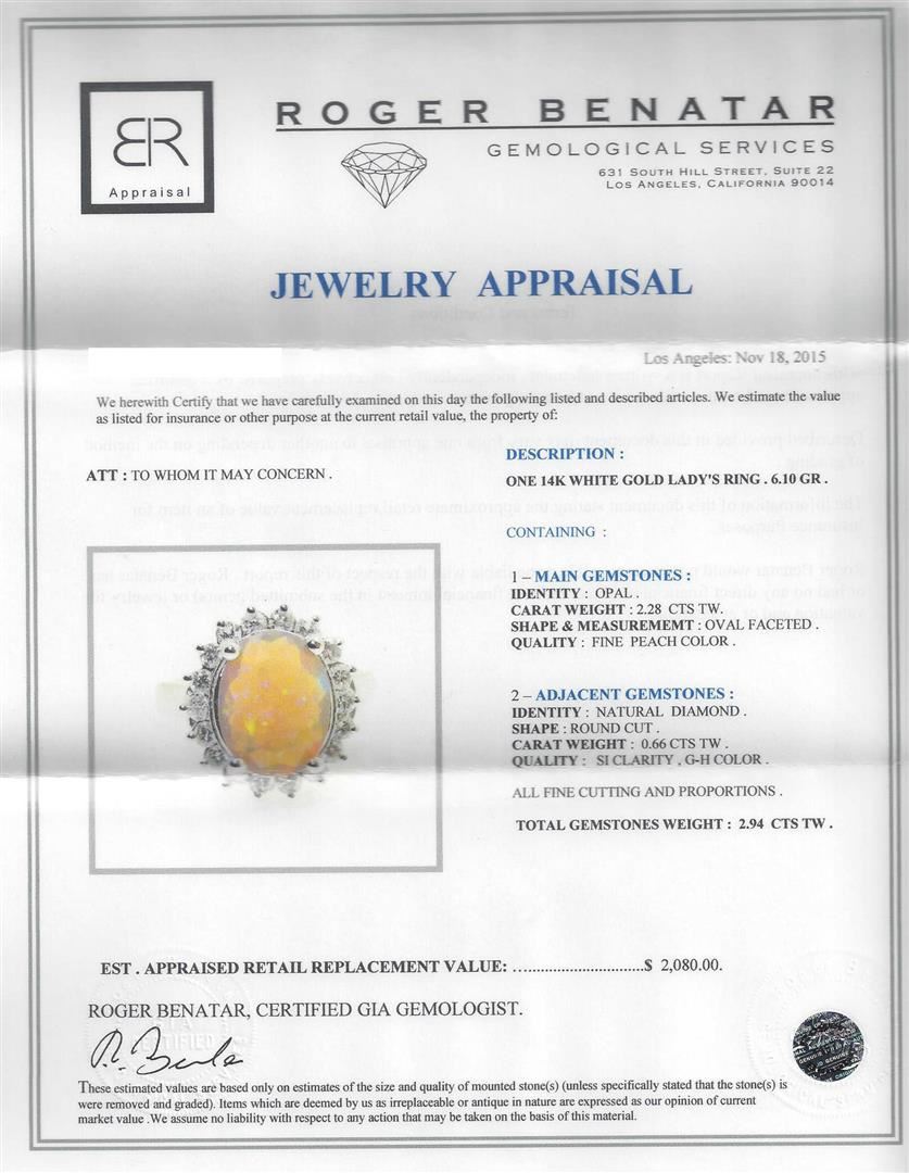One 14K White Gold Lady's Ring. 6.10 GR. Containing: Main Gemstones: Identity: Opal. Carat Weight 2.28 CTS TW. Shape & Measurement: Oval Faceted. Quality: Fine Peach Color. Adjacent Gemstones: Identity: Natural Diamond. Shape: Round Cut. Carat Weight: 0.66 CTS TW. Quality: SI Clarity, G-H Color. All Fine Cutting And Proportions. Total Gemstones Weight: 2.94 CTW TW. RBGS Appraised.