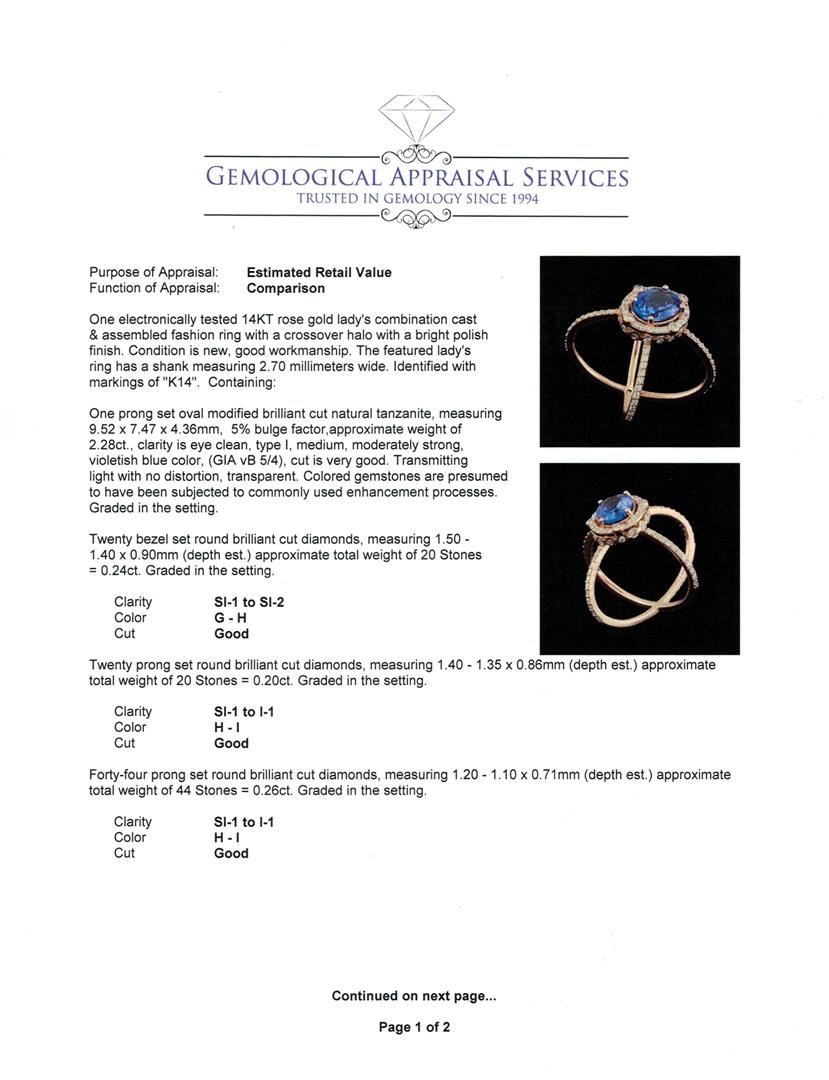 One electronically tested 14KT rose gold lady's combination cast & assembled fashion ring with a crossover halo with a bright polish finish. The featured lady's ring has a shank measuring 2.70 millimeters wide. Identified with markings of "K14". Condition is new, good workmanship. Containing: One prong set oval modified brilliant cut natural tanzanite, measuring 9.52 x 7.47 x 4.36mm, 5%. bulge factor, approximate weight of 2.28ct., clarity is eye clean, type I, medium, moderately strong, violetish blue color, (GIA vB 5/4), cut is very good. Transmitting light with no distortion, transparent. Colored gemstones are presumed to have been subjected to commonly used enhancement processes. Graded in the setting. Twenty bezel set round brilliant cut diamonds, measuring 1.50 - 1.40 x 0.90mm (depth est.) approximate total weight of 20 Stones = 0.24ct. Graded in the setting. Clarity: SI-1 to SI-2. Color: G - Good Twenty prong set round brilliant cut diamonds, measuring 1.40 - 1.35 x 0.86mm (depth est.) approximate total weight of 20 Stones = 0.20ct. Graded in the setting. Clarity: SI-1 to I-1. Color: H - I. Cut Good Forty-Four prong set round brilliant cut diamonds, measuring 1.20 - 1.10 x 0.71mm (depth est.) approximate total weight of 44 Stones = 0.26ct. Graded in the setting. Clarity: SI-1 to I-1. Color: H - I. Cut Good. Total Weight of Colored Stones 2.28ct. Total Weight of Diamonds 0.70ct. Total Weight of Ring 5.10gm. GAS Appraised at $6,385.00.