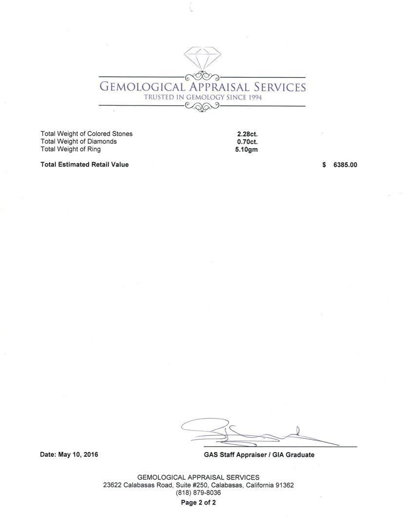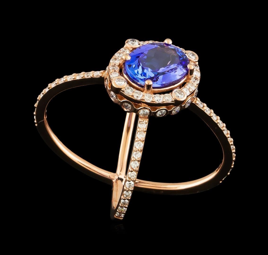 One electronically tested 14KT rose gold lady's combination cast & assembled fashion ring with a crossover halo with a bright polish finish. The featured lady's ring has a shank measuring 2.70 millimeters wide. Identified with markings of "K14". Condition is new, good workmanship. Containing: One prong set oval modified brilliant cut natural tanzanite, measuring 9.52 x 7.47 x 4.36mm, 5%. bulge factor, approximate weight of 2.28ct., clarity is eye clean, type I, medium, moderately strong, violetish blue color, (GIA vB 5/4), cut is very good. Transmitting light with no distortion, transparent. Colored gemstones are presumed to have been subjected to commonly used enhancement processes. Graded in the setting. Twenty bezel set round brilliant cut diamonds, measuring 1.50 - 1.40 x 0.90mm (depth est.) approximate total weight of 20 Stones = 0.24ct. Graded in the setting. Clarity: SI-1 to SI-2. Color: G - Good Twenty prong set round brilliant cut diamonds, measuring 1.40 - 1.35 x 0.86mm (depth est.) approximate total weight of 20 Stones = 0.20 ct. Graded in the setting. Clarity: SI-1 to I-1. Color: H - I. Cut Good Forty-Four prong set round brilliant cut diamonds, measuring 1.20 - 1.10 x 0.71mm (depth est.) approximate total weight of 44 Stones = 0.26ct. Graded in the setting. Clarity: SI-1 to I-1. Color: H - I. Cut Good. Total Weight of Colored Stones 2.28ct. Total Weight of Diamonds 0.70 ct. Total Weight of Ring 5.10gm. GAS Appraised.