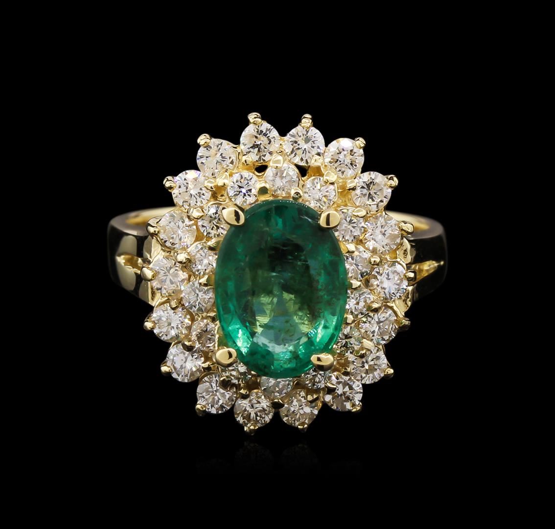 One electronically tested 14KT yellow gold ladies cast emerald and diamond ring with a bright polish finish. The ring features an oval emerald set within a gallery of round brilliant diamonds, supported by split shoulders and a ribbed under gallery, completed by a two and one half millimeter wide band. Identified with markings of "14K". Condition is new, good workmanship. Containing: One prong set oval mixed cut natural emerald, measuring 9.40 x 7.00 x 5.10mm, 16% bulge factor, exact weight 2.28ct., clarity is moderately included, type III, medium dark, very slightly grayish, very slightly bluish green color, (GIA vslbG 6/3), cut is good. Transmitting light with a minimum of distortion, transparent. Naturally occurring internal & external characteristics are present. Indications of oil residue. Graded in the setting. Thirty-Two prong set round brilliant cut diamonds, measuring 2.20 - 1.70 x 1.19mm exact total weight 32 Stones = 0.99ct. Graded in the setting. Clarity: SI-2 to I-1. Color: G - H. Total Weight of Colored Stones 2.28ct. Total Weight of Diamonds 0.99ct. Total Weight of Ring 5.71gm. AIG Appraised at $8,380.00.