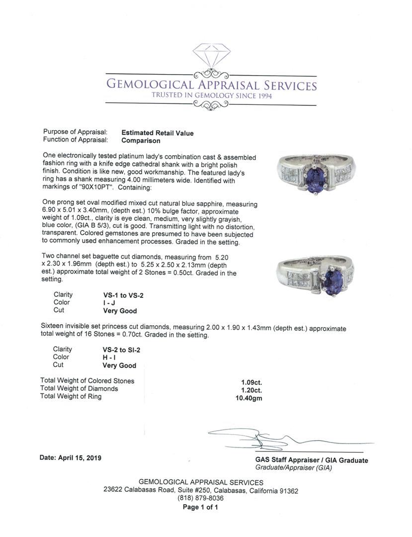 One electronically tested platinum lady's combination cast & assembled fashion ring with a knife edge cathedral shank with a bright polish finish. The featured lady's ring has a shank measuring 4.00 millimeters wide. Identified with markings of '90X10PT'.