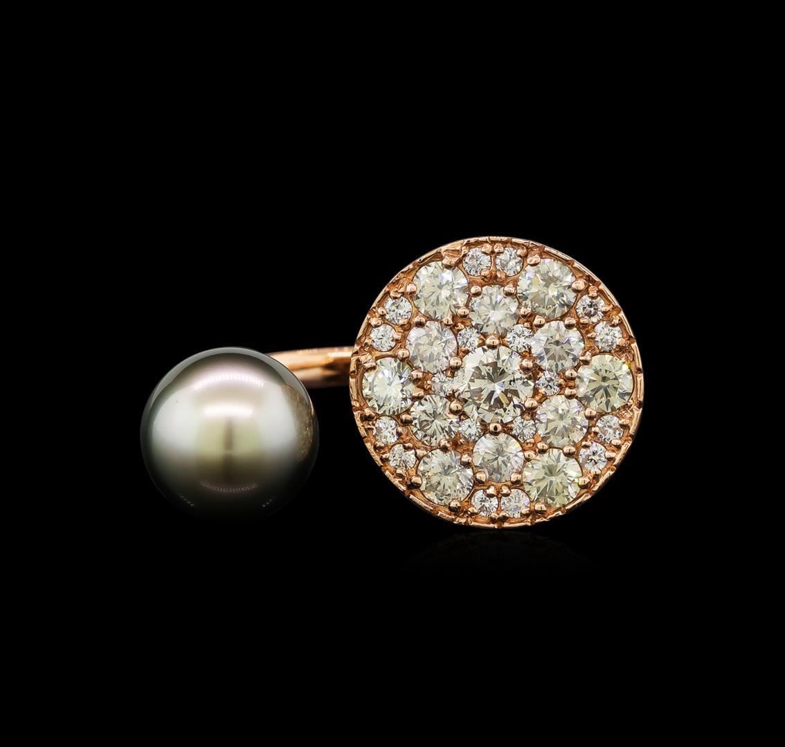 One electronically tested 14KT rose gold lady's cast fashion cuff ring with a bright polish finish. The featured lady's ring has a shank measuring 2.30 millimeters wide. Identified with markings of 'K14'. Condition is new, good workmanship. Containing: One Tahitian pearl, 10.7mm to 10.2mm in size. The pearl is silver in color, green overtone with a good luster, off round, and clean. Graded in the setting. One prong set round brilliant cut diamond, measuring 4.90 - 4.86 x 3.03mm (depth est.) approximate weight of 0.45ct. Graded in the setting. Clarity SI-1. Color: H - I Cut Good Six prong set round brilliant cut diamonds, measuring 3.50 - 3.40 x 2.07mm (depth est.) approximate total weight of 6 Stones = 0.90ct. Graded in the setting. Clarity SI-1 to SI-2. Color: I - J Cut Good Six prong set round brilliant cut diamonds, measuring 3.10 - 3.00 x 1.89mm (depth est.) approximate total weight of 6 Stones = 0.65ct. Graded in the setting. Clarity VS-2 to SI-2. Color: I - J Cut Good Eighteen prong set round brilliant cut diamonds, measuring 1.70 - 1.50 x 0.99mm (depth est.) approximate total weight of 18 Stones = 0.29ct. Graded in the setting. Clarity SI-1 to I-1. Color: H - I Cut Good. Total Weight of Diamonds 2.29ct.. Total Weight of Ring 7.90gm. GAS Appraised.