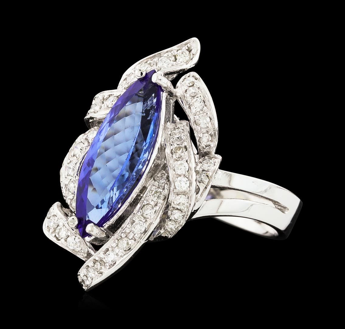 One electronically tested 14KT white gold lady's cast fashion ring with a swirled basket halo with a bright polish finish. The featured lady's ring has a shank measuring 3.48 millimeters wide. Identified with markings of 'K14'. Condition is new, good workmanship. Containing: One prong set marquise modified brilliant cut natural tanzanite, measuring 16.92 x 6.00 x 4.11mm, (depth est.) approximate weight of 2.29ct., clarity is eye clean, medium, very slightly grayish, violetish blue color, (GIA vB 5/3), cut is very good. Transmitting light with no distortion, transparent. Colored gemstones are presumed to have been subjected to commonly used enhancement processes. Graded in the setting. Twenty-Six prong set round brilliant cut diamonds, measuring 1.40 - 1.35 x 0.86mm (depth est.) approximate total weight of 26 Stones = 0.26ct. Graded in the setting. Clarity SI-1 to I-1. Color: G - H Cut Good Eighteen prong set round brilliant cut diamonds, measuring 1.25 - 1.15 x 0.74mm (depth est.) approximate total weight of 18 Stones = 0.12ct. Graded in the setting. Clarity SI-1 to I-1. Color: G - H Cut Good. Total Weight of Colored Stones 2.29ct.. Total Weight of Diamonds 0.38ct.. Total Weight of Ring 6.50gm. GAS Appraised at $5,405.00.