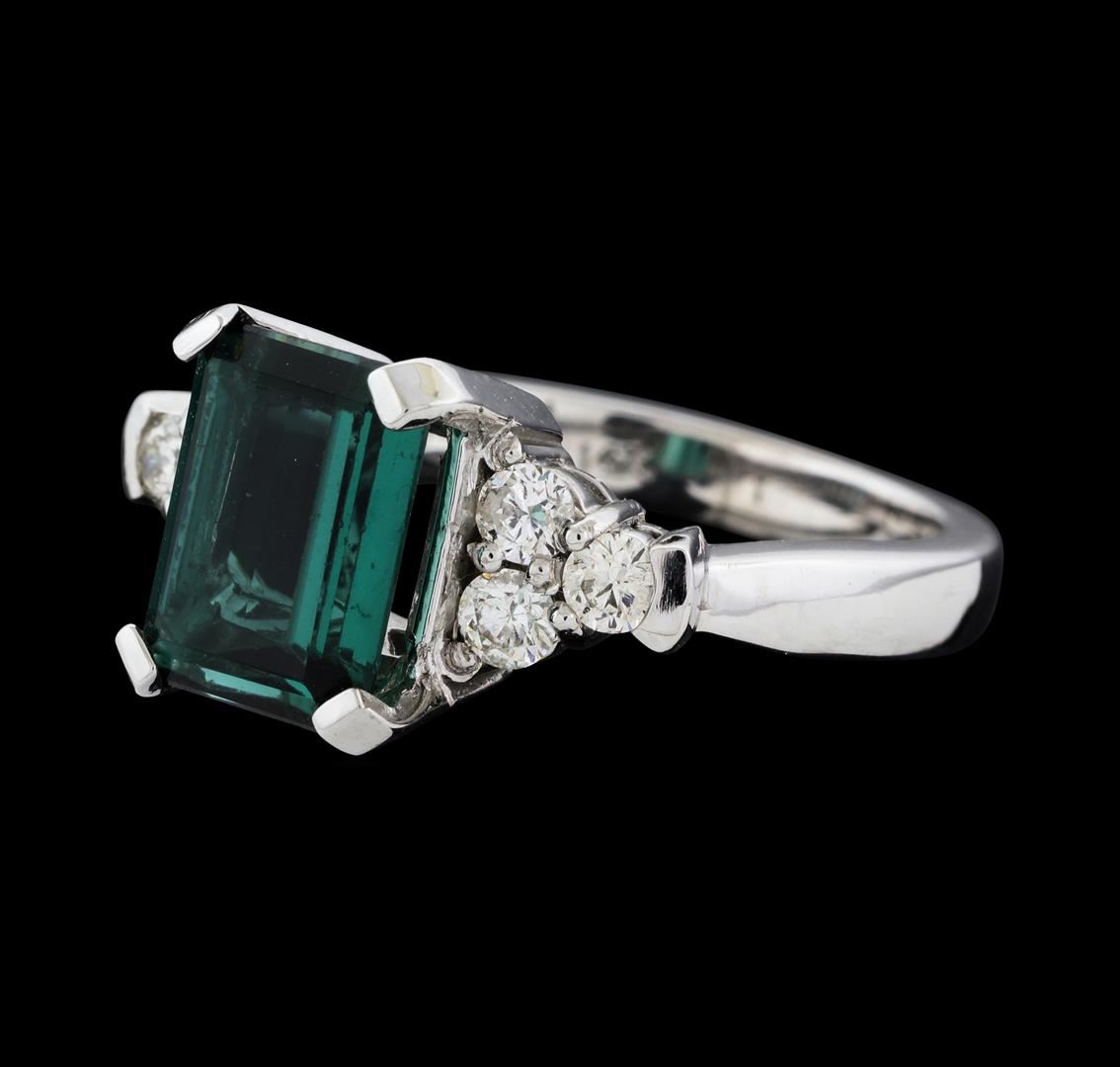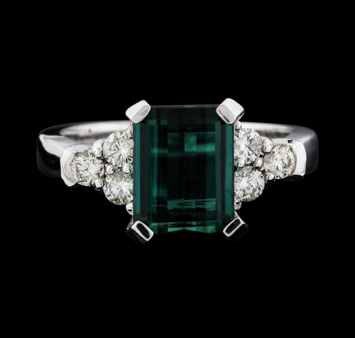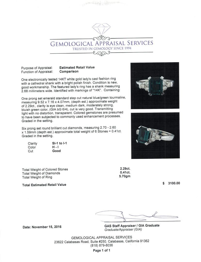 One electronically tested 14KT white gold lady's cast fashion ring with a cathedral shank with a bright polish finish. The featured lady's ring has a shank measuring 2.68 millimeters wide. Identified with markings of '14K'. Condition is new, good workmanship. Containing: One prong set emerald standard step cut natural blue/green tourmaline, measuring 9.52 x 7.16 x 4.07mm, (depth est.) approximate weight of 2.29ct., clarity is eye clean, medium dark, moderately strong, bluish green color, (GIA bG 6/4), cut is very good. Transmitting light with no distortion, transparent. Colored gemstones are presumed to have been subjected to commonly used enhancement processes. Graded in the setting. Six prong set round brilliant cut diamonds, measuring 2.70 - 2.60 x 1.59mm (depth est.) approximate total weight of 6 Stones = 0.41ct. Graded in the setting. Clarity SI-1 to I-1. Color: H - I Cut Good. Total Weight of Colored Stones 2.29ct.. Total Weight of Diamonds 0.41ct.. Total Weight of Ring 5.70gm. GAS Appraised at $3,100.00.