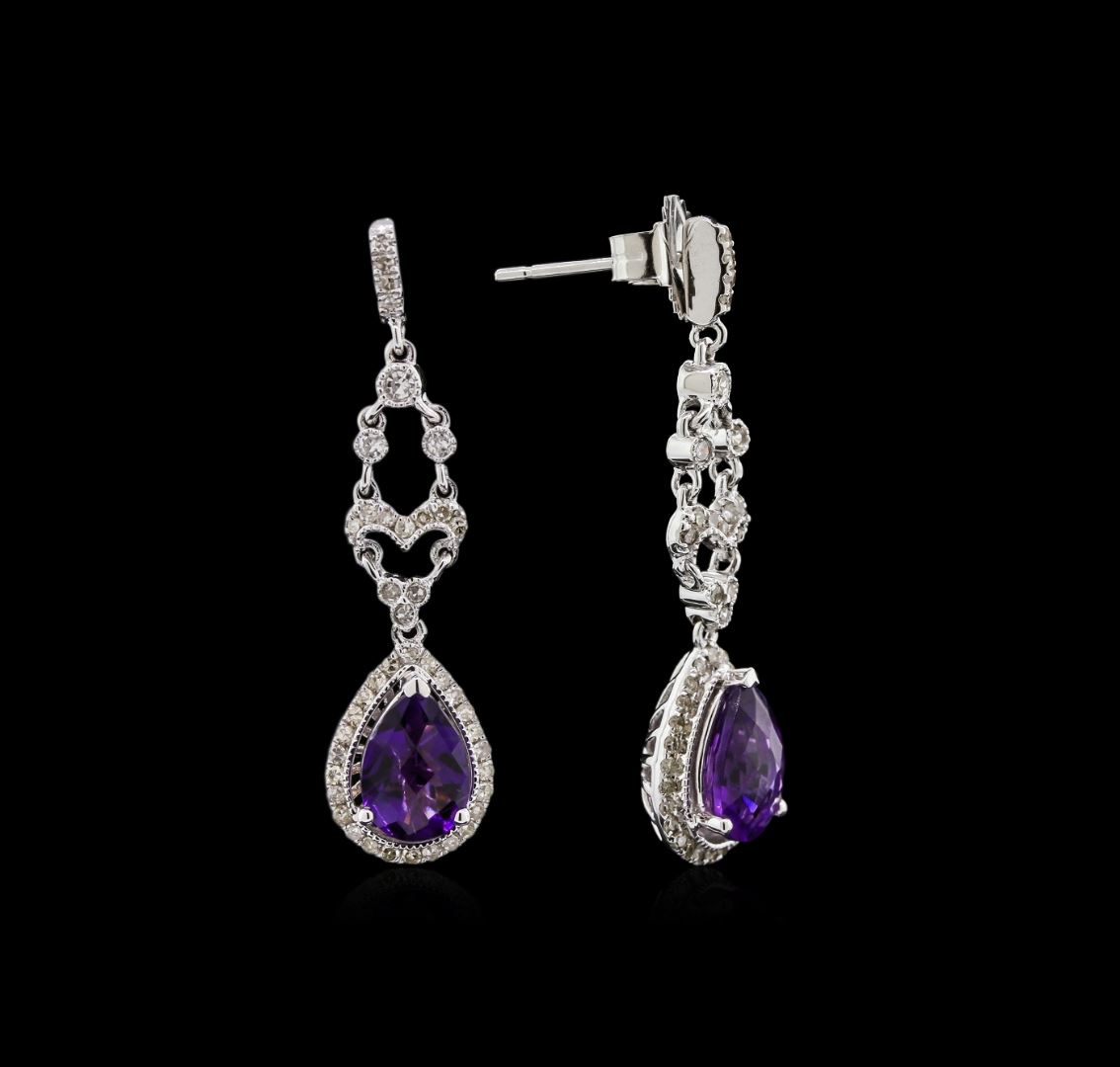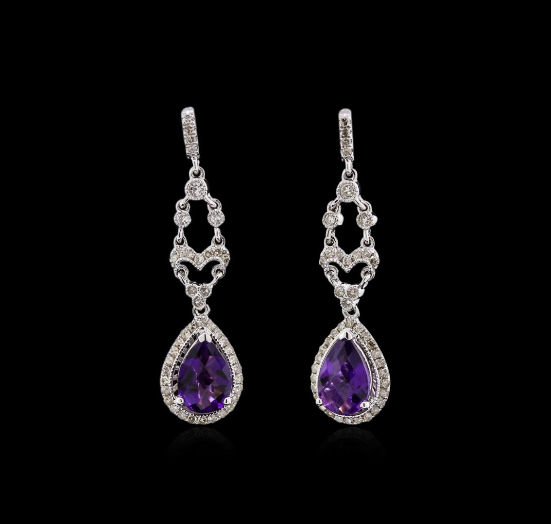 One pair of dangle earrings featuring: 14KT white gold weighing 5.30 grams containing amethysts with a total weight of 2.29ct and diamonds with a total weight of 0.60ct.