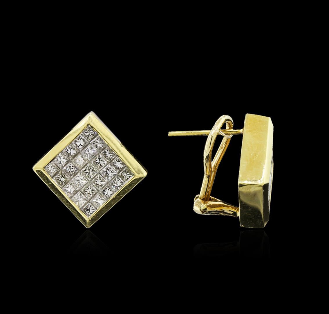 One pair electronically tested 18KT yellow gold ladies cast & assembled diamond earrings with lever backs. Each earring features a gallery of princess cut diamonds. Condition is good. Containing: Fifty invisible set princess cut diamonds, measuring 2.00 x 2.00 x 1.40mm (depth est.) approximate total weight of 50 Stones = 2.30ct. Graded in the setting. Clarity: VS-1 to SI-1. Color: G - I. Total Weight of Diamonds 2.30ct. Total Weight of Earrings 11.34gm. AIG Appraised at $7,790.00.