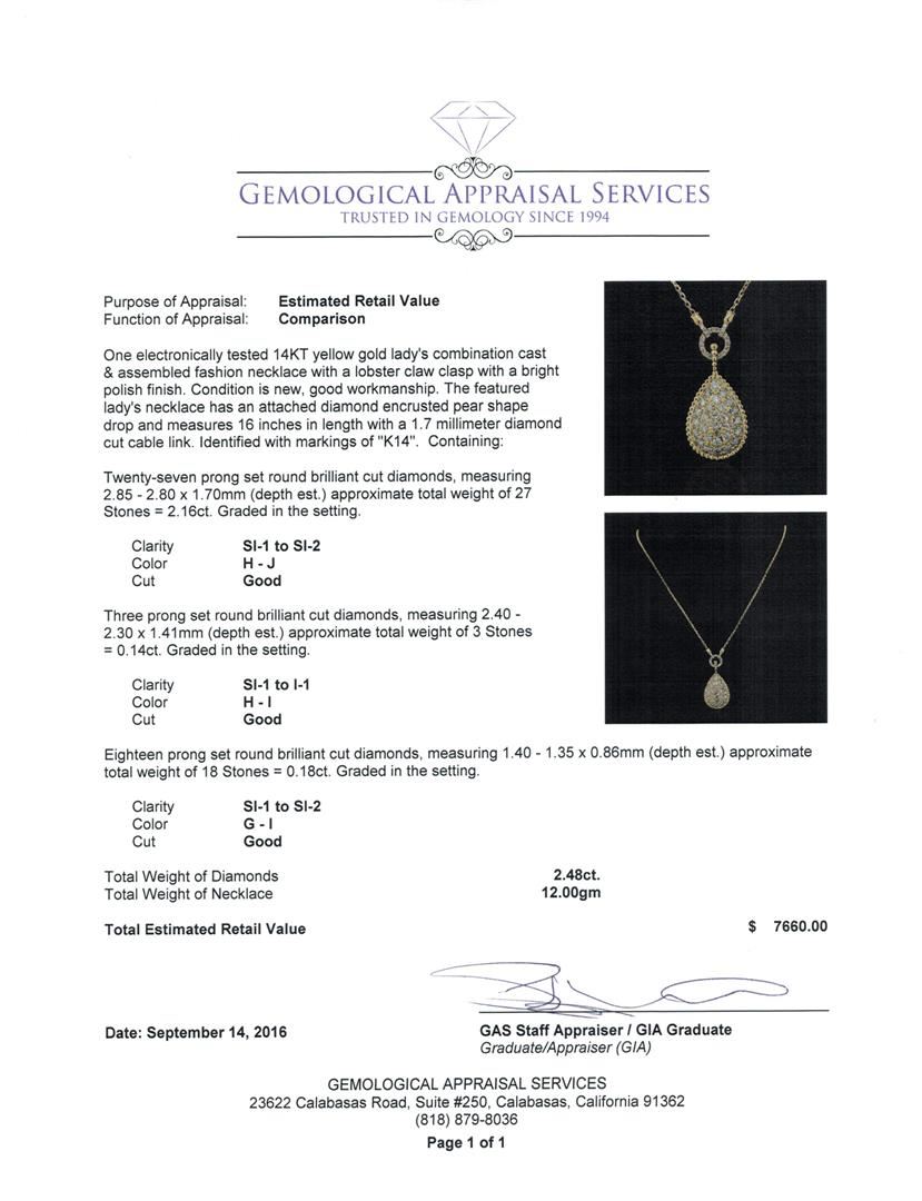 One electronically tested 14KT yellow gold lady's combination cast & assembled fashion necklace with a lobster claw clasp with a bright polish finish. The featured lady's necklace has an attached diamond encrusted pear shape drop and measures 16 inches in length with a 1.7 millimeter diamond cut cable link. Identified with markings of 'K14'. Condition is new, good workmanship. Containing: Twenty-Seven prong set round brilliant cut diamonds, measuring 2.85 - 2.80 x 1.70mm (depth est.) approximate total weight of 27 Stones = 2.16ct. Graded in the setting. Clarity SI-1 to SI-2. Color: H - J Cut Good Three prong set round brilliant cut diamonds, measuring 2.40 - 2.30 x 1.41mm (depth est.) approximate total weight of 3 Stones = 0.14ct. Graded in the setting. Clarity SI-1 to I-1. Color: H - I Cut Good Eighteen prong set round brilliant cut diamonds, measuring 1.40 - 1.35 x 0.86mm (depth est.) approximate total weight of 18 Stones = 0.18ct. Graded in the setting. Clarity SI-1 to SI-2. Color: G - I Cut Good. Total Weight of Diamonds 2.48ct.. Total Weight of Necklace 12.00gm GAS Appraised at $7,660.00.