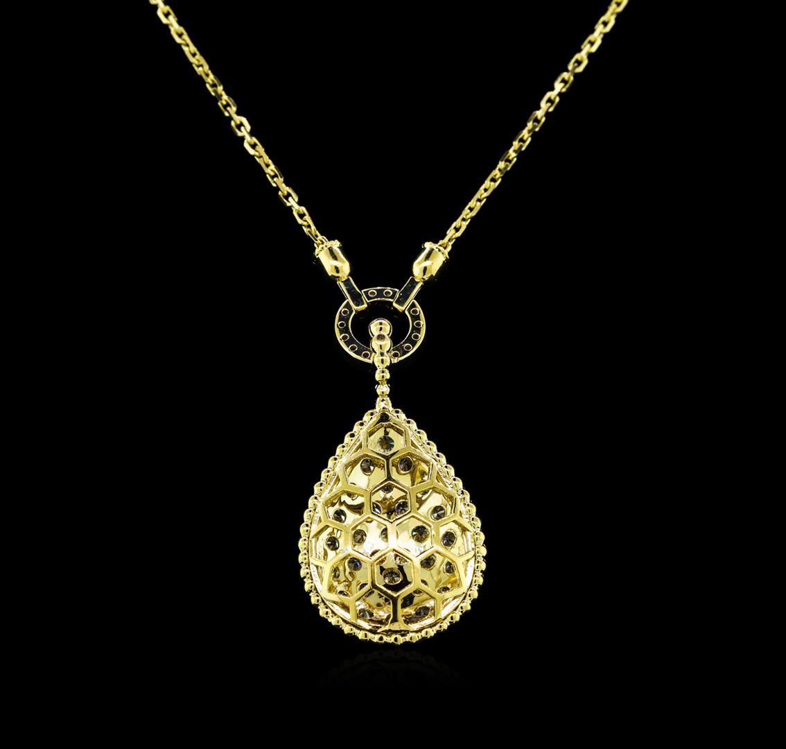One electronically tested 14KT yellow gold lady's combination cast & assembled fashion necklace with a lobster claw clasp with a bright polish finish. The featured lady's necklace has an attached diamond encrusted pear shape drop and measures 16 inches in length with a 1.7 millimeter diamond cut cable link. Identified with markings of 'K14'. Condition is new, good workmanship. Containing: Twenty-Seven prong set round brilliant cut diamonds, measuring 2.85 - 2.80 x 1.70mm (depth est.) approximate total weight of 27 Stones = 2.16ct. Graded in the setting. Clarity SI-1 to SI-2. Color: H - J Cut Good Three prong set round brilliant cut diamonds, measuring 2.40 - 2.30 x 1.41mm (depth est.) approximate total weight of 3 Stones = 0.14ct. Graded in the setting. Clarity SI-1 to I-1. Color: H - I Cut Good Eighteen prong set round brilliant cut diamonds, measuring 1.40 - 1.35 x 0.86mm (depth est.) approximate total weight of 18 Stones = 0.18ct. Graded in the setting. Clarity SI-1 to SI-2. Color: G - I Cut Good. Total Weight of Diamonds 2.48ct.. Total Weight of Necklace 12.00gm GAS Appraised at $7,660.00.