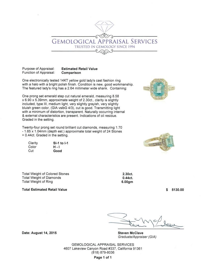 One electronically tested 14KT yellow gold lady's cast fashion ring with a halo with a bright polish finish. The featured lady's ring has a 2.64 millimeter wide shank. Condition is new, good workmanship. Containing: One prong set emerald step cut natural emerald, measuring 8.58 x 6.90 x 5.39mm, approximate weight of 2.30ct., clarity is slightly included, type III, medium light, very slightly grayish, very slightly bluish green color, (GIA vslbG 4/3), cut is good. Transmitting light with a minimum of distortion, transparent. Naturally occurring internal & external characteristics are present. Indications of oil residue. Graded in the setting. Twenty-Four prong set round brilliant cut diamonds, measuring 1.70 - 1.65 x 1.04mm (depth est.) approximate total weight of 24 Stones = 0.44ct. Graded in the setting. Clarity: SI-1 to I-1. Color: H - I. Cut Good. Total Weight of Colored Stones 2.30ct. Total Weight of Diamonds 0.44ct. Total Weight of Ring 6.00gm. GAS Appraised at $5,130.00.