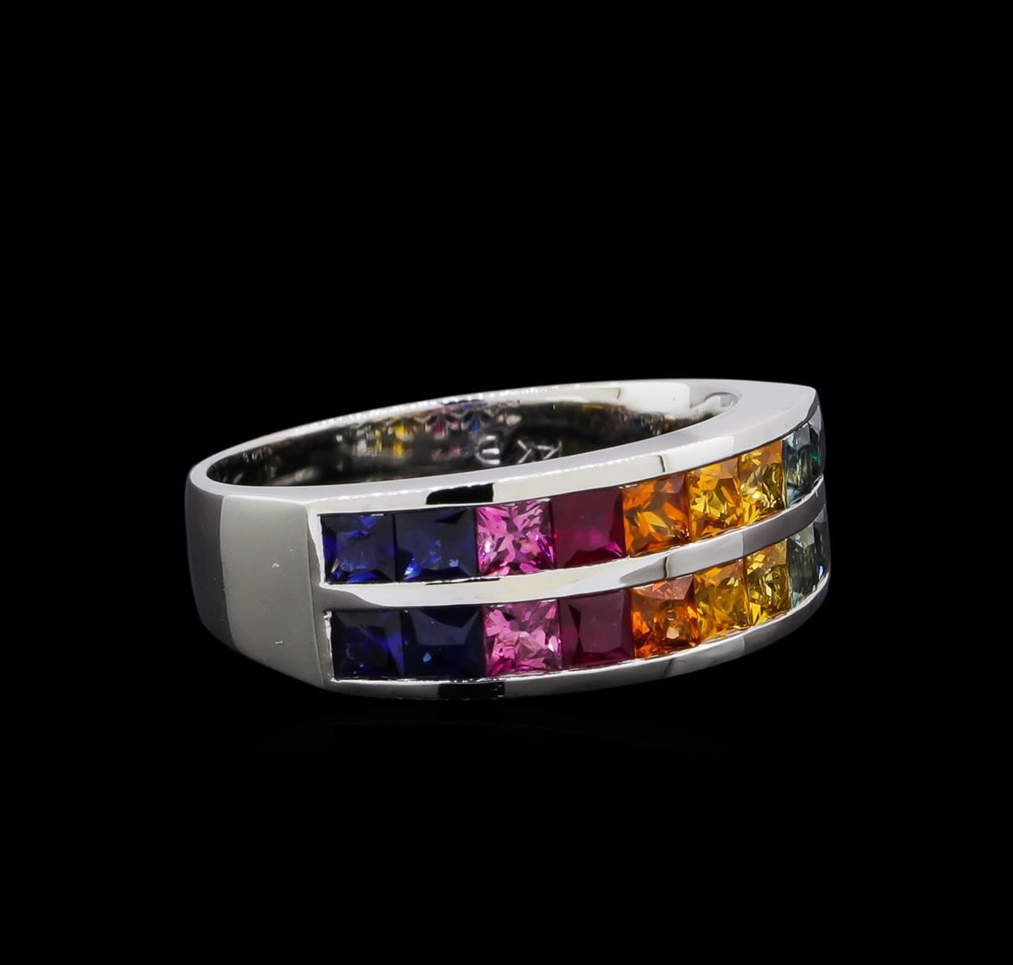 One electronically tested 14KT white gold lady's cast fashion ring with a two row wide band with a bright polish finish. The featured lady's ring has a shank measuring 3.73 millimeters in width. Identified with markings of "14K". Condition is new, good workmanship. Containing: Eighteen channel set princess modified brilliant cut natural multi-color sapphires, measuring 2.60 x 2.50 x 1.88mm, (depth est.) approximate total weight of 2.30ct., clarity is eye clean (Gem Dialogue The hue ranges from blue to pink to red to orange to yellow to blue-green.), cut is very good. Transmitting light with no distortion, transparent. Colored gemstones are presumed to have been subjected to commonly used enhancement processes. Graded in the setting. Total Weight of Colored Stones 2.30ct. Total Weight of Ring 5.70gm. GAS Appraised at $2,775.00.