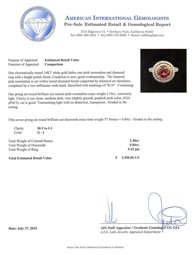 One electronically tested 14KT white gold ladies cast pink tourmaline and diamond ring with a bright polish finish. The featured pink tourmaline is set within tiered diamond bezels supported by diamond set shoulders, completed by a two millimeter wide band. Identified with markings of "K14". Condition is new, good workmanship. Containing: One prong set round brilliant cut natural pink tourmaline exact weight 2.30ct., extremely light Clarity is eye clean, medium dark, very slightly greyish, purplish pink color, (GIA pPi6/3), cut is good. Transmitting light with no distortion, transparent. Graded in the setting. Fifty-Seven prong set round brilliant cut diamonds exact total weight 57 Stones = 0.84ct. Graded in the setting. Clarity: SI-2 to I-1. Color: G - I. Total Weight of Colored Stones 2.30ct. Total Weight of Diamonds 0.84ct. Total Weight of Ring 5.43gm. AIG Appraised at $3,950.00.