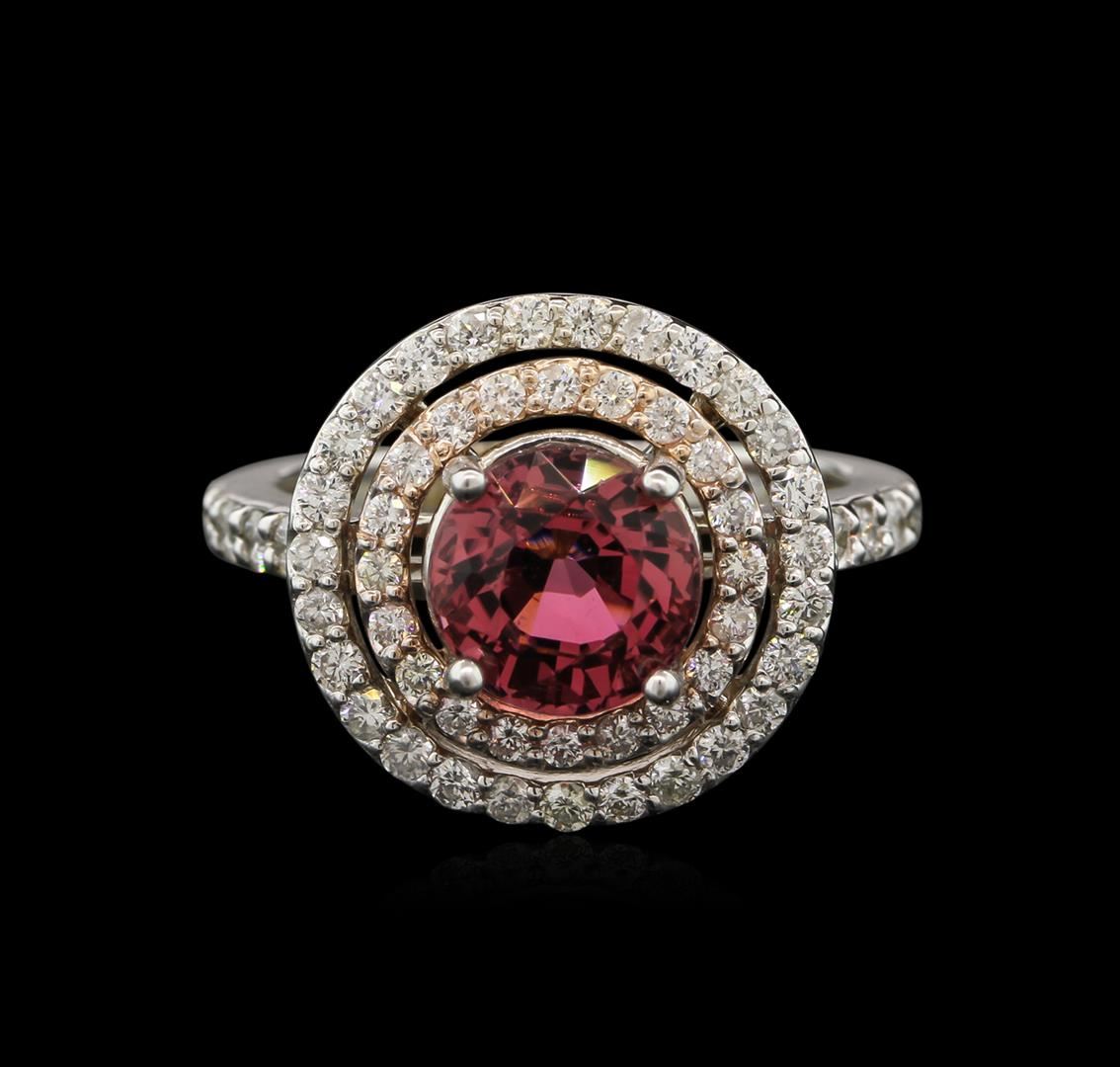 One electronically tested 14KT white gold ladies cast pink tourmaline and diamond ring with a bright polish finish. The featured pink tourmaline is set within tiered diamond bezels supported by diamond set shoulders, completed by a two millimeter wide band. Identified with markings of "K14". Condition is new, good workmanship. Containing: One prong set round brilliant cut natural pink tourmaline exact weight 2.30ct., extremely light Clarity is eye clean, medium dark, very slightly greyish, purplish pink color, (GIA pPi6/3), cut is good. Transmitting light with no distortion, transparent. Graded in the setting. Fifty-Seven prong set round brilliant cut diamonds exact total weight 57 Stones = 0.84ct. Graded in the setting. Clarity: SI-2 to I-1. Color: G - I. Total Weight of Colored Stones 2.30ct. Total Weight of Diamonds 0.84ct. Total Weight of Ring 5.43gm. AIG Appraised at $3,950.00.