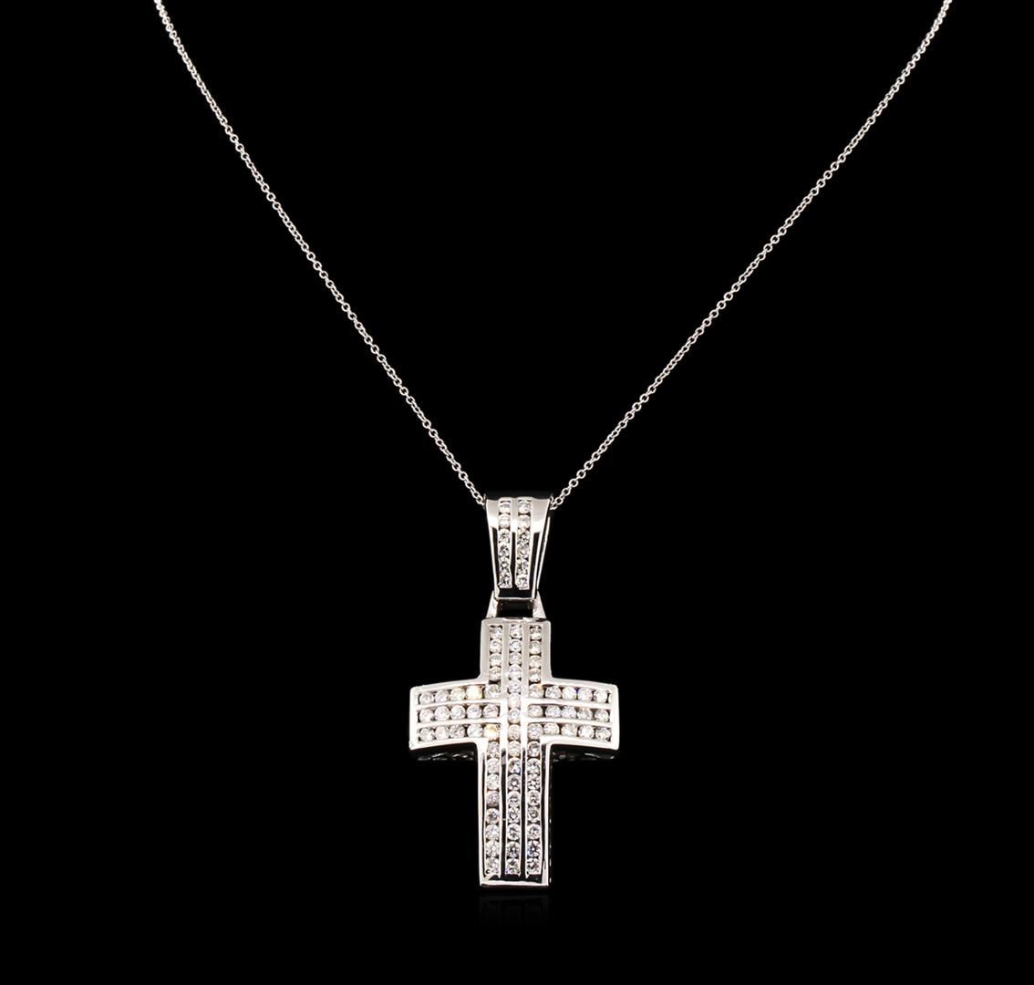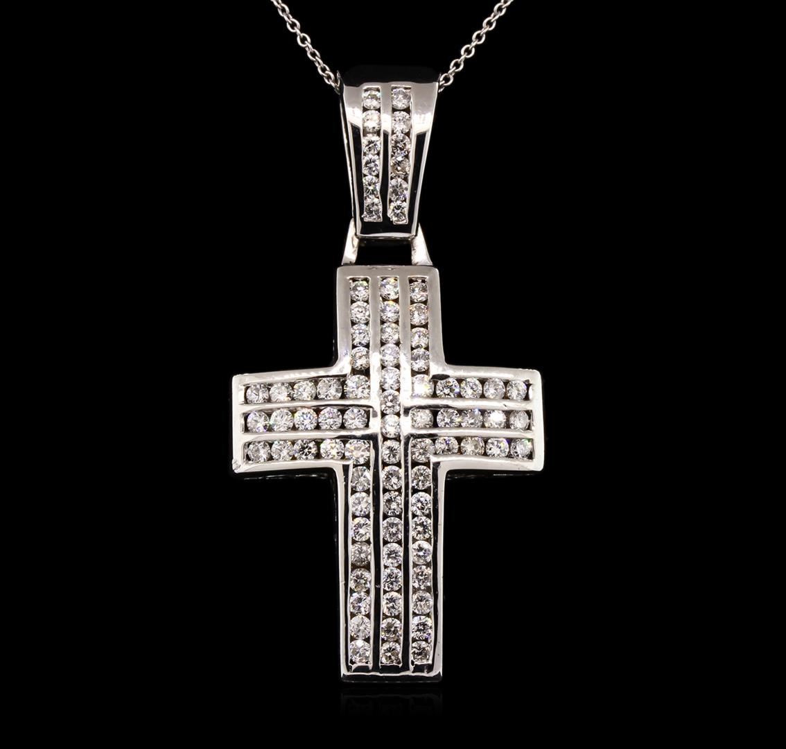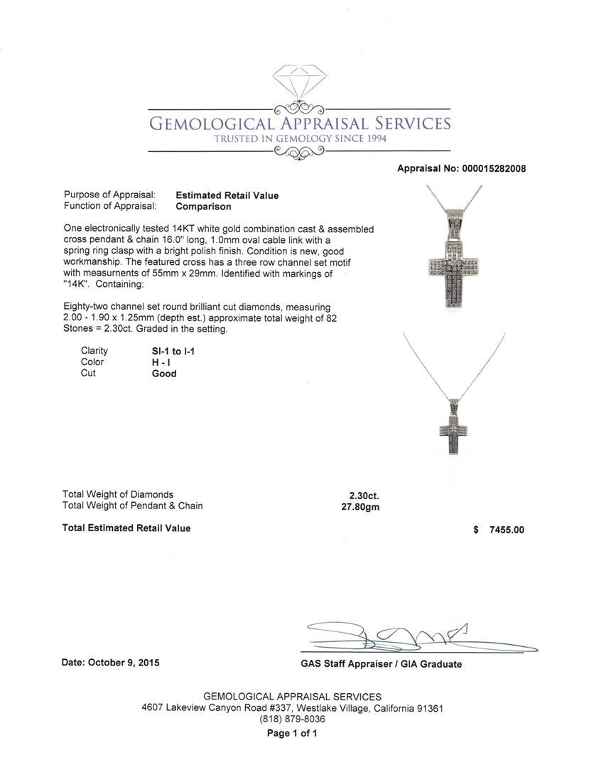 One electronically tested 14KT white gold combination cast & assembled cross pendant & chain 16.0" long, 1.0mm oval cable link with a spring ring clasp with a bright polish finish. The featured cross has a three row channel set motif with measurnents of 55mm x 29mm. Identified with markings of "14K". Condition is new, good workmanship. Containing: Eighty-Two channel set round brilliant cut diamonds, measuring 2.00 - 1.90 x 1.25mm (depth est.) approximate total weight of 82 Stones = 2.30ct. Graded in the setting. Clarity: SI-1 to I-1. Color: H - I. Cut Good. Total Weight of Diamonds 2.30ct. Total Weight of Pendant & Chain 27.80gm. GAS Appraised at $7,455.00.