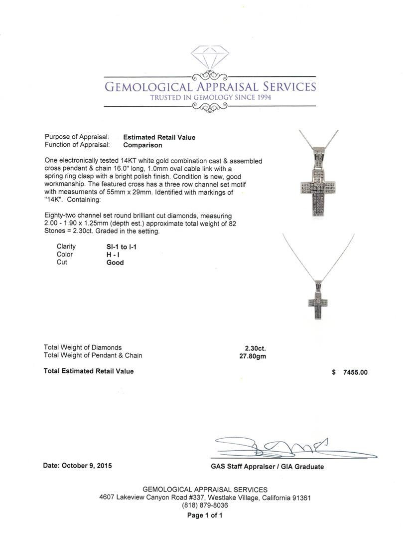 One electronically tested 14KT white gold combination cast & assembled cross pendant & chain 16.0" long, 1.0mm oval cable link with a spring ring clasp with a bright polish finish. The featured cross has a three row channel set motif with measurnents of 55mm x 29mm. Identified with markings of "14K". Condition is new, good workmanship. Containing: Eighty-Two channel set round brilliant cut diamonds, measuring 2.00 - 1.90 x 1.25mm (depth est.) approximate total weight of 82 Stones = 2.30ct. Graded in the setting. Clarity: SI-1 to I-1. Color: H - I. Cut Good. Total Weight of Diamonds 2.30ct. Total Weight of Pendant & Chain 27.80gm. GAS Appraised at $7,455.00.